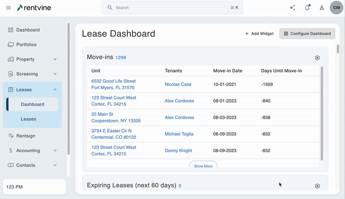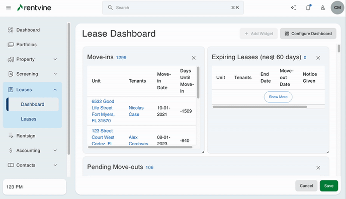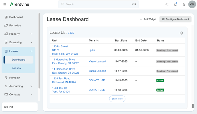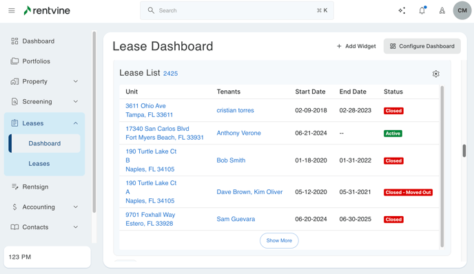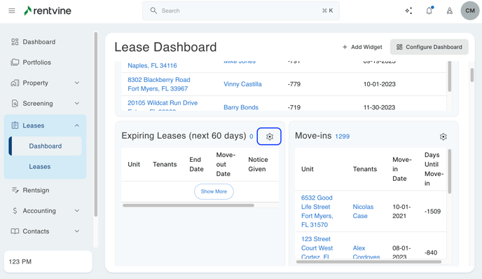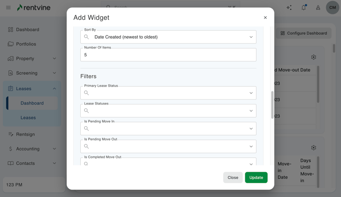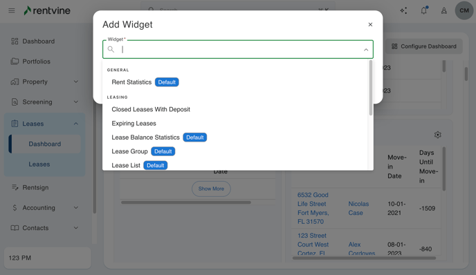 - Lease List- This will allow you to choose from columns like start date, end date, tenants, status, etc. It will also let you select from a list of filters to customize this widget to your preference. A good use case for this is for grouping pending move-outs or move-ins.