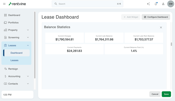 - Lease Balance Statistics- This will allow you to display a number of statistics, like current charges, current rent charges, and current balance paid.