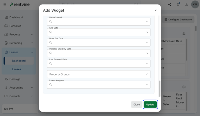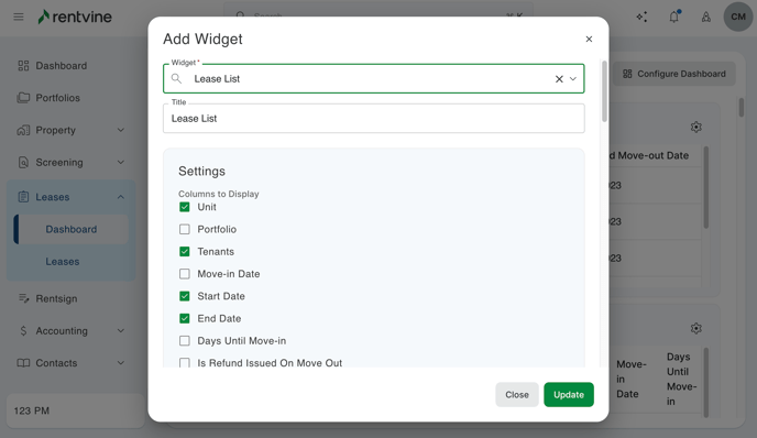 - Columns to Display- This will show all the columns that can be added to the widget. This includes things like unit, tenants, start date, days until lease ends, etc.