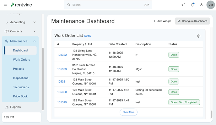 - To view your maintenance dashboard, you can click the maintenance tab and then click "Dashboard". This will show you the default maintenance dashboard that you have configured. This dashboard is on a per-user basis, so all users can customize this dashboard to their needs.