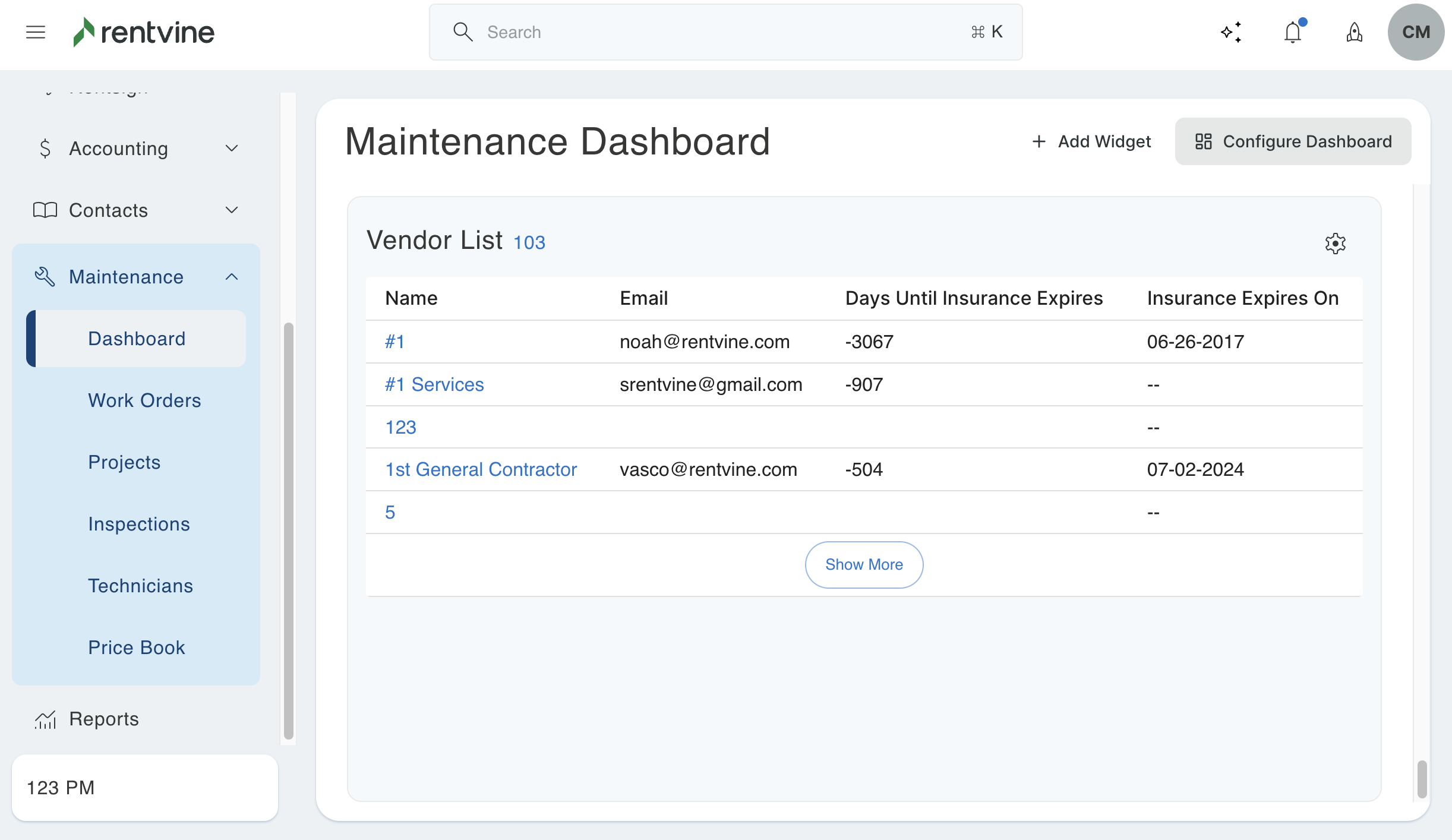 Vendor List- Allows you to add important vendor information to easily access, sort by different parameters, and filter by vendor insurance expiration dates.