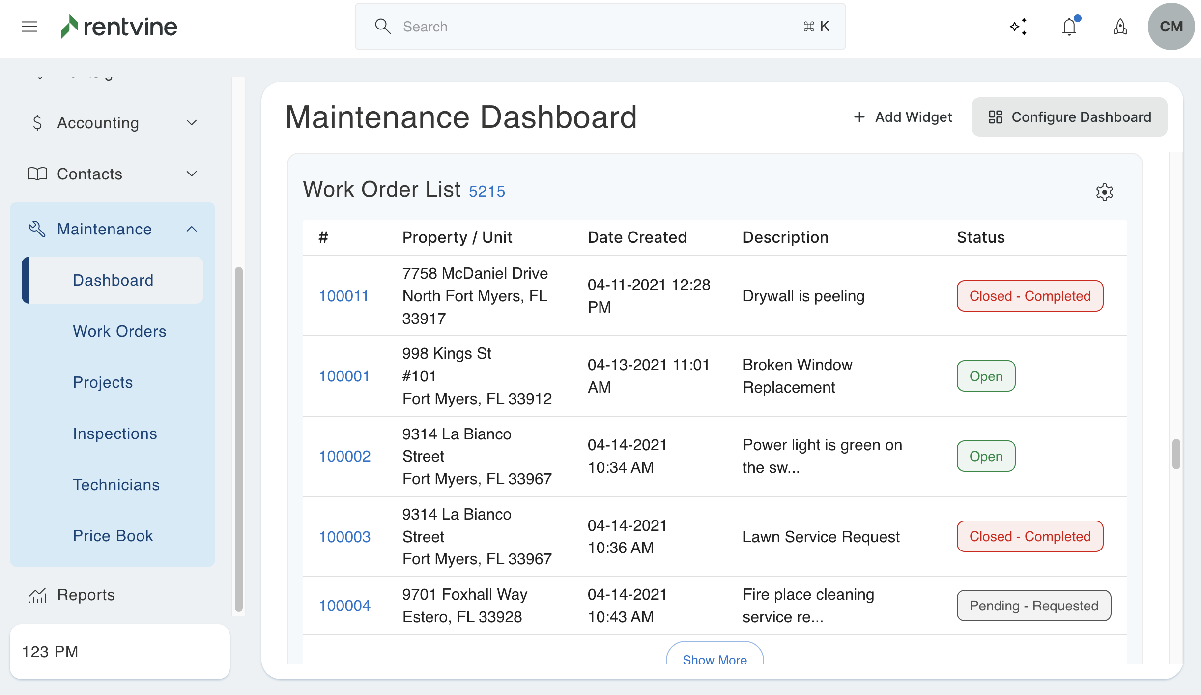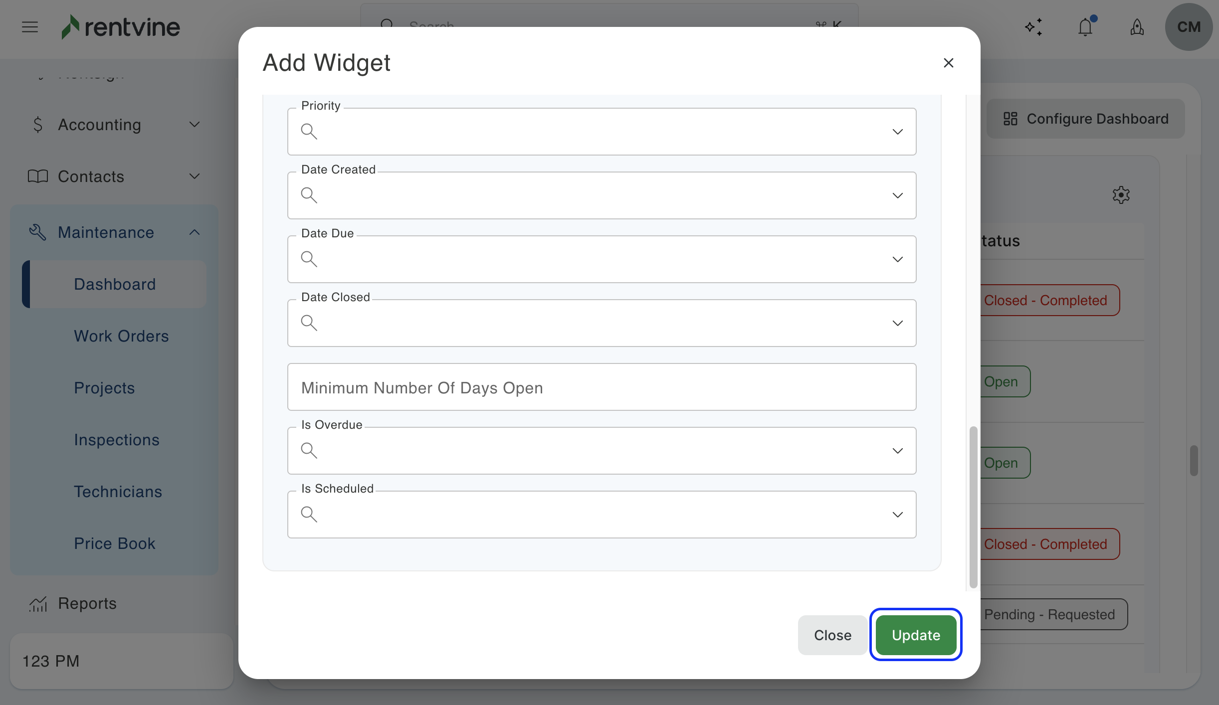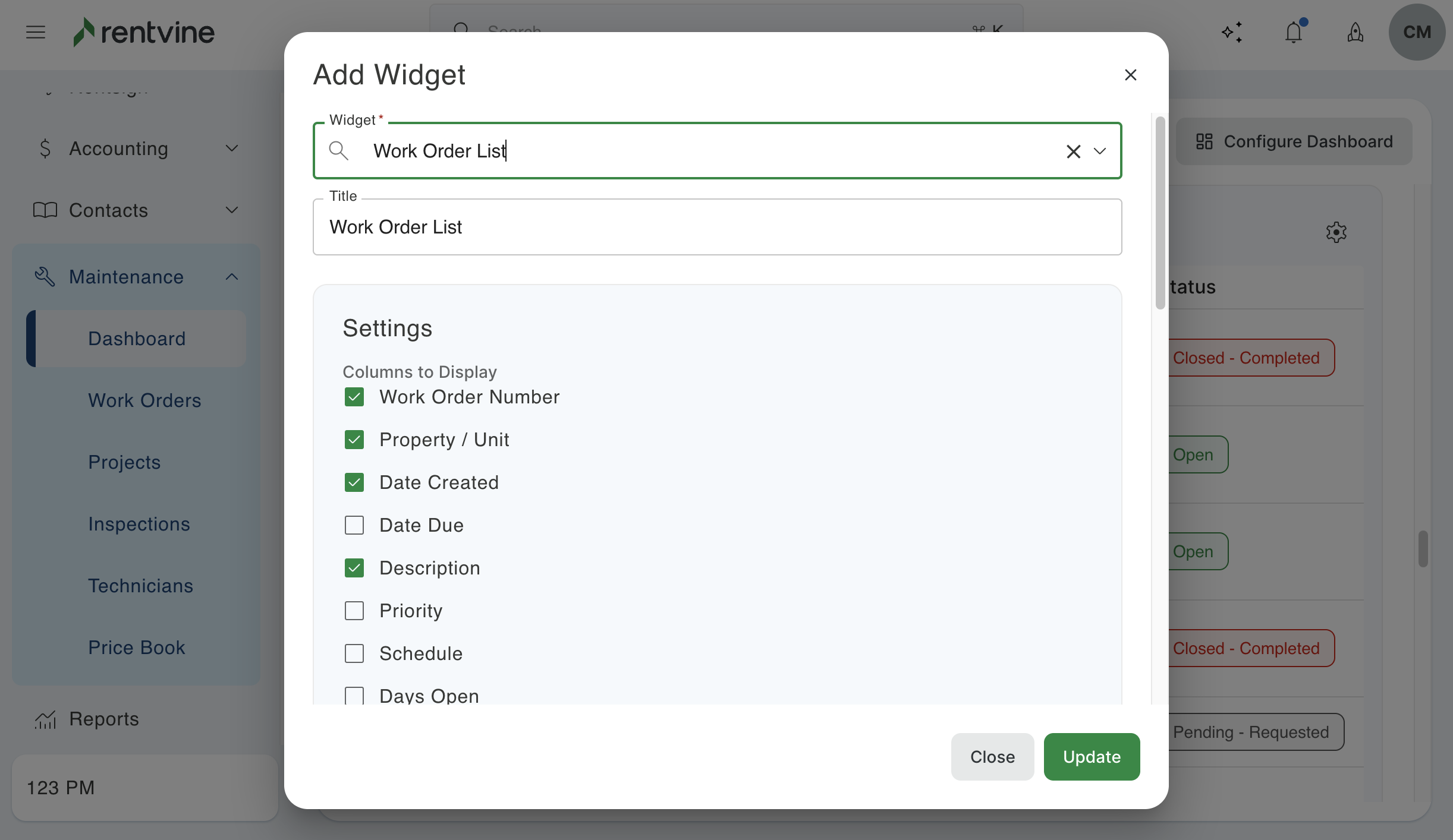 - Columns to Display- This will show all the columns that can be added to the widget. This includes things like property, date created, days open, and status.