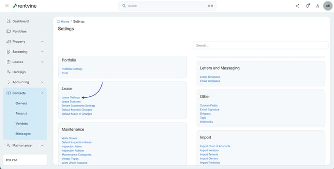 - To start, you will need to go into your global settings and then click on the lease settings.