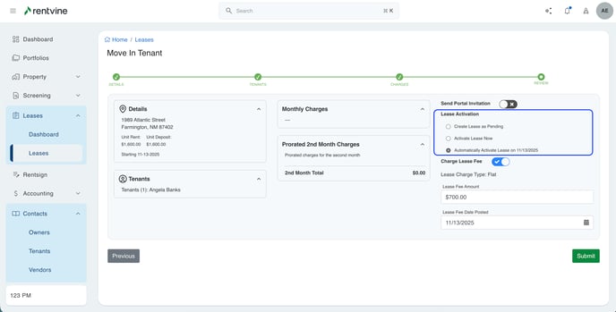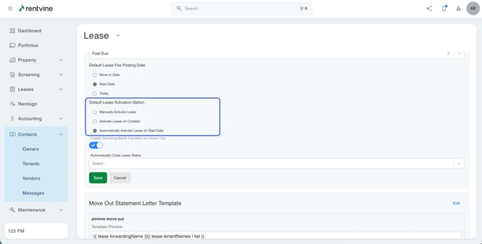 - In here, you can click the edit button in the top right. This will allow you to set your preference for lease activation. You can choose between if you would like to manually activating the lease, if the lease should be automatically set to activate upon creation, or if you would like the lease to activate based on the start date set earlier in the move-out.