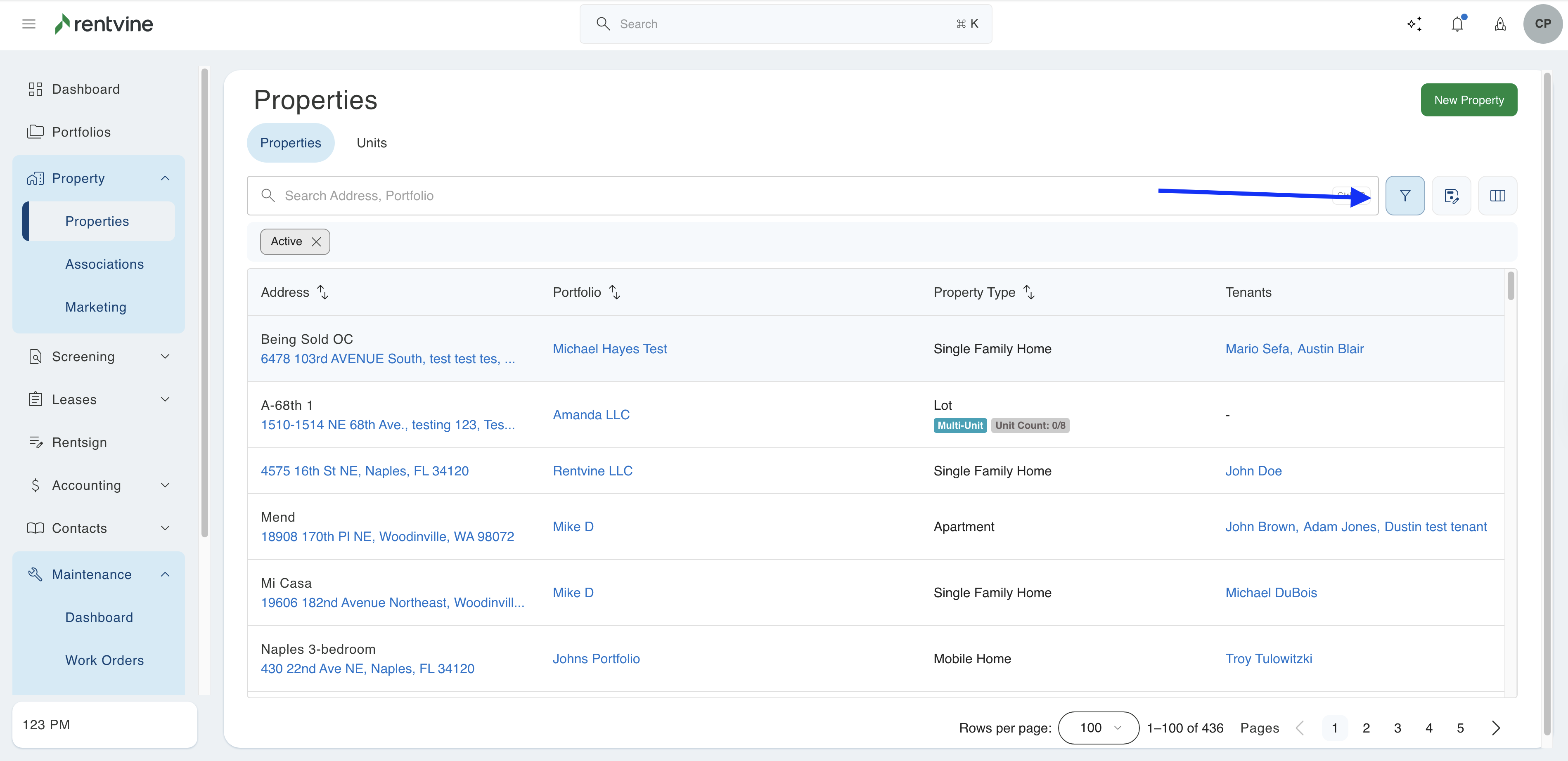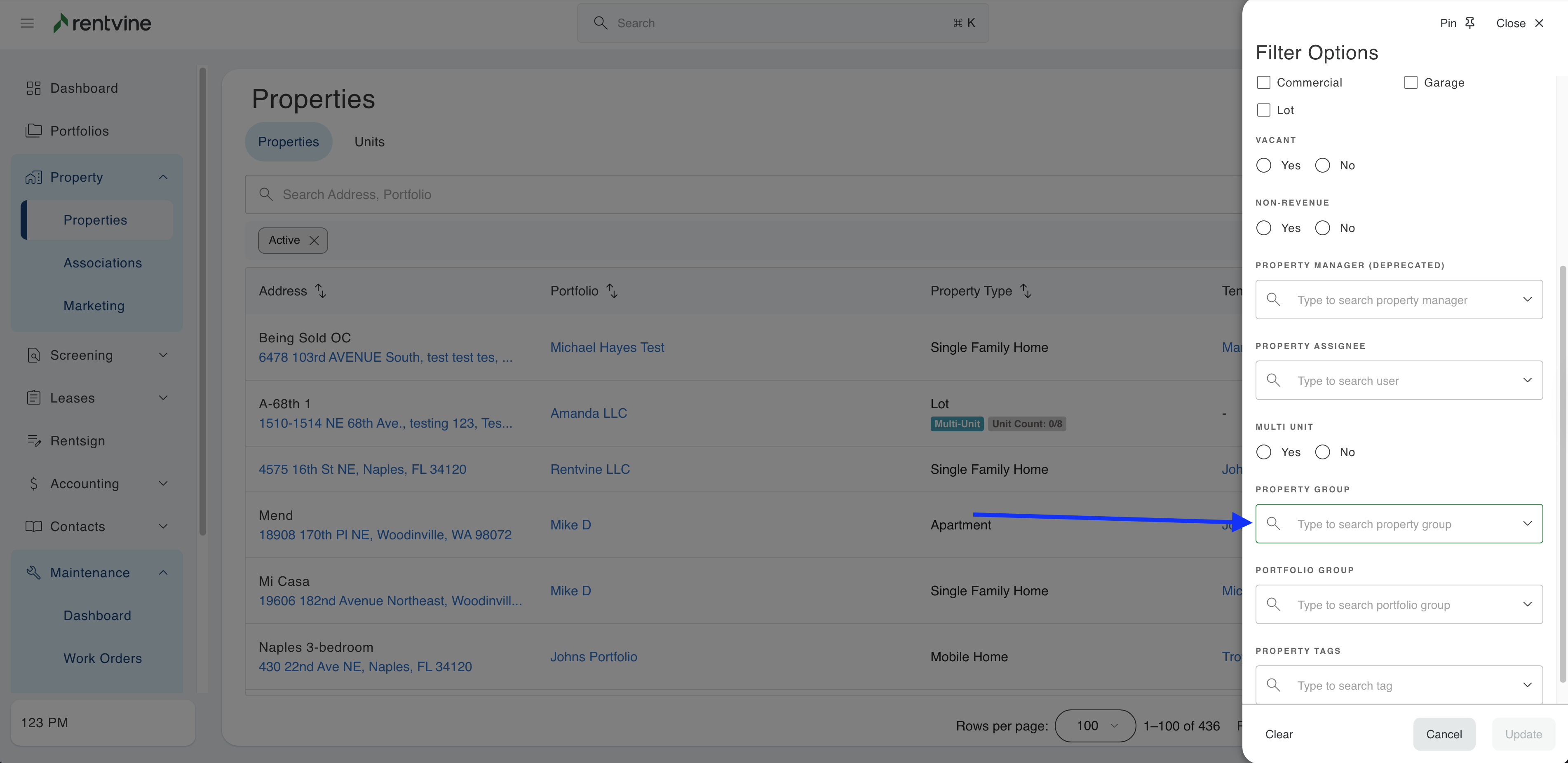 Property groups are used to categorize certain properties for filtering and report purposes. You will be able to click the filter icon from the main properties tab and filter by all of the properties associated to a property group. You can also add property groups as filters and columns on all property/unit reports.