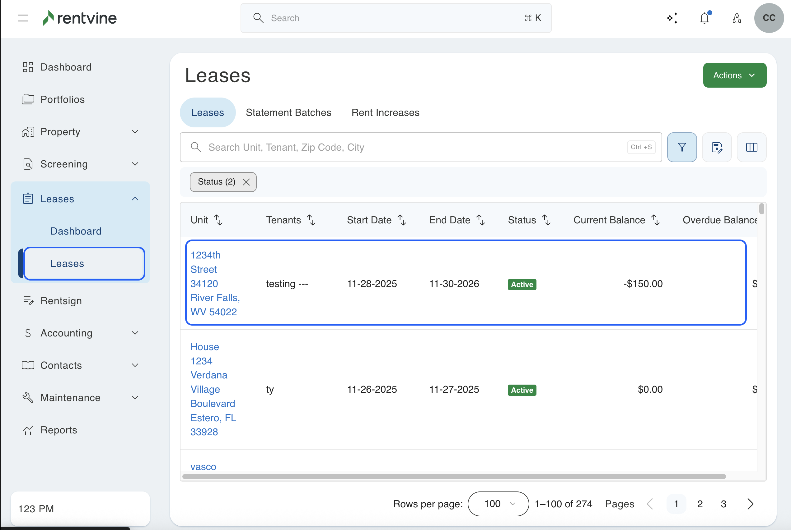 2. Next, you will search for the specific lease you want to add or remove a tenant from. You will then click on that property to pull up the lease.
