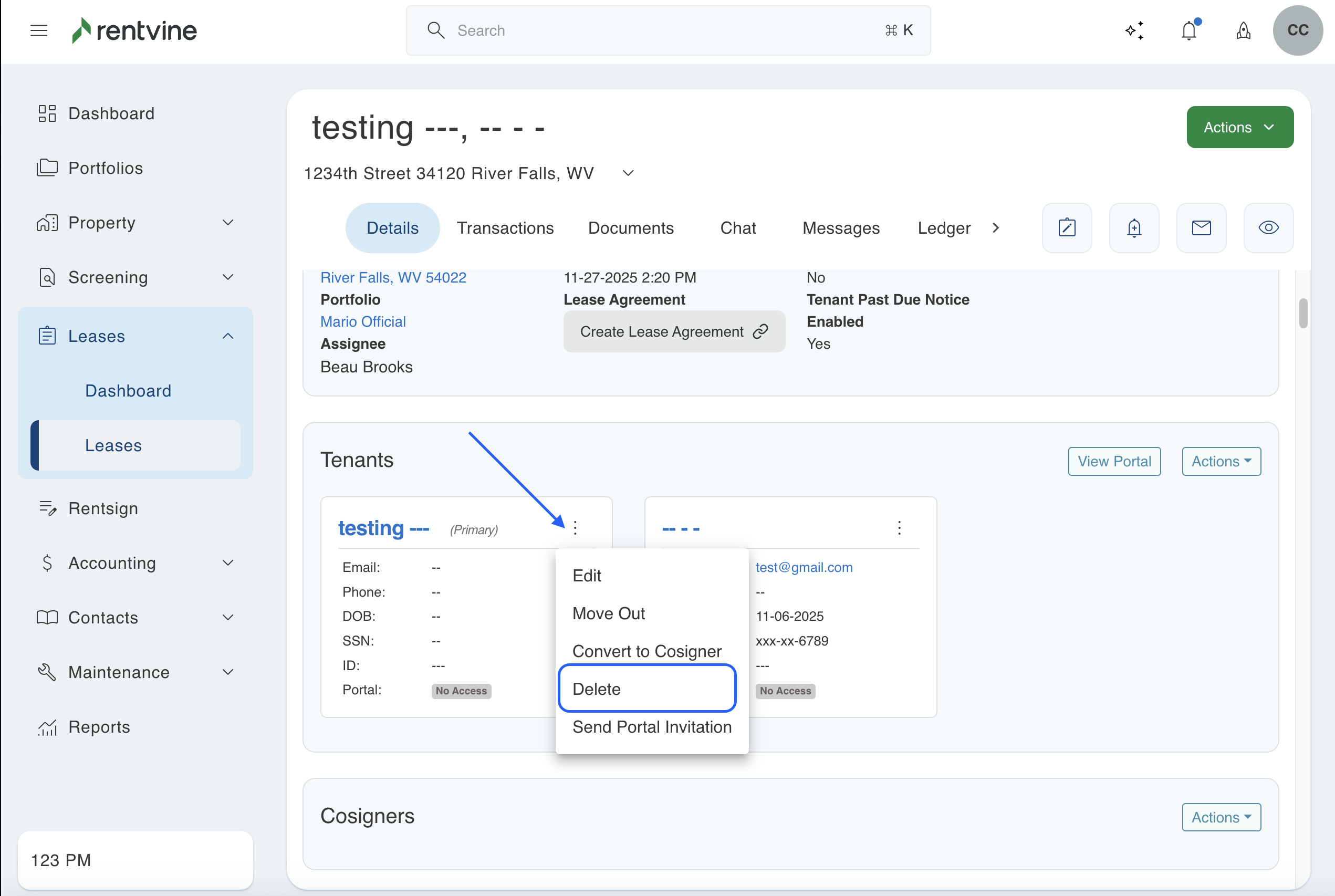 1. Look in the details tab of the lease. There will be a box labeled "Tenants" that you will go to. On the very right of this box, there will be an ellipsis for each tenant on the lease. You will click on this and select "Delete," and this will take them off the lease.