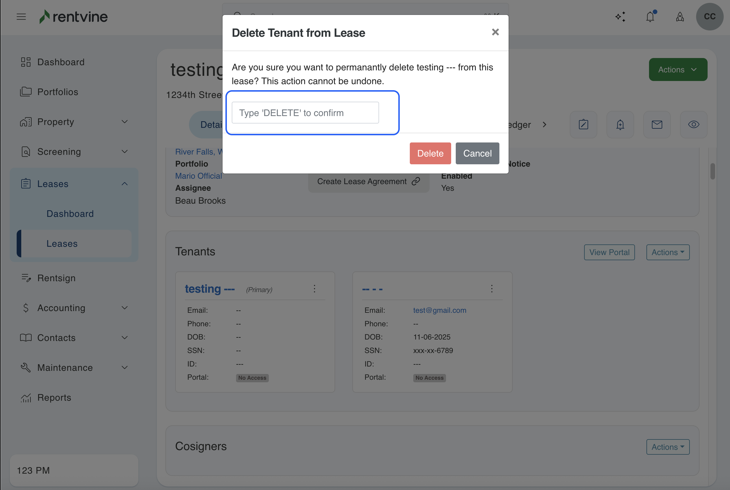 2. This will bring up a confirmation, making sure you want to remove this tenant from the lease. You will click on the red delete button to confirm.