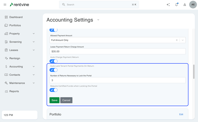 - Number of Returns Necessary to Lock the Portal- This will allow you to change how many times this needs to happen to disable portal payments on a lease