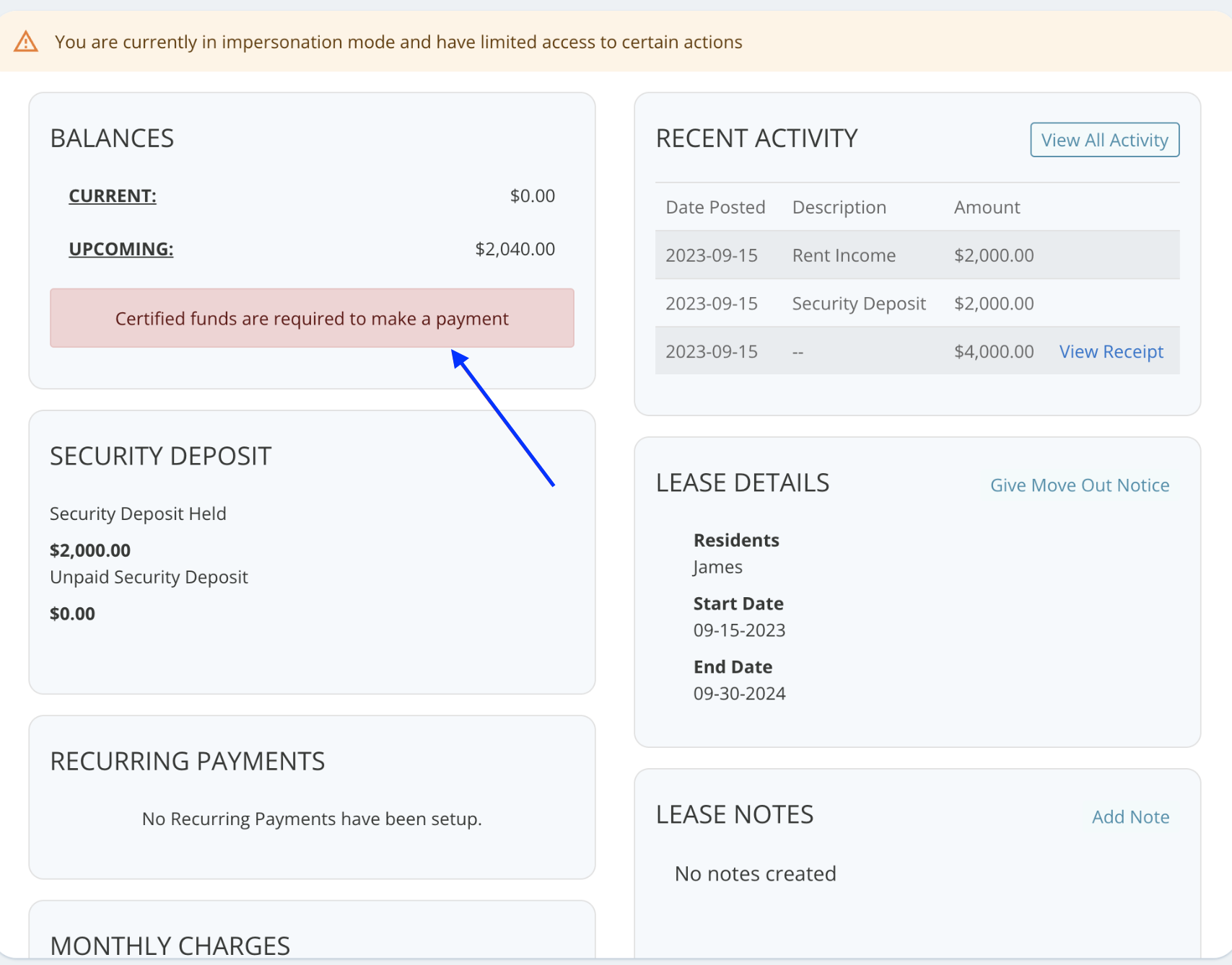 - Once you click save here the tenants portal will be automatically locked based on the parameters set. The tenant portal will either show that the portal payments are disabled or certified funds are required, based on whether you have the certified funds toggle selected.