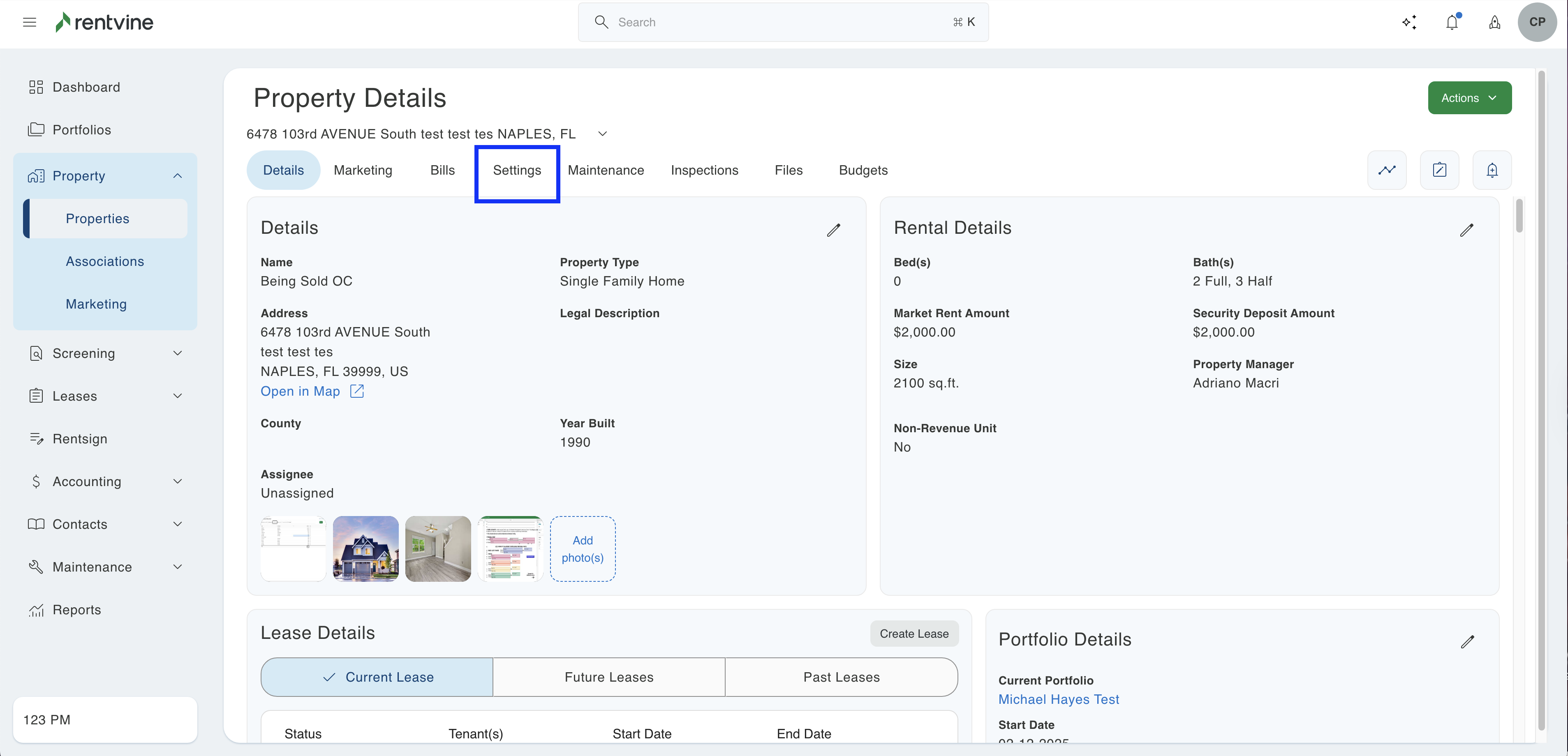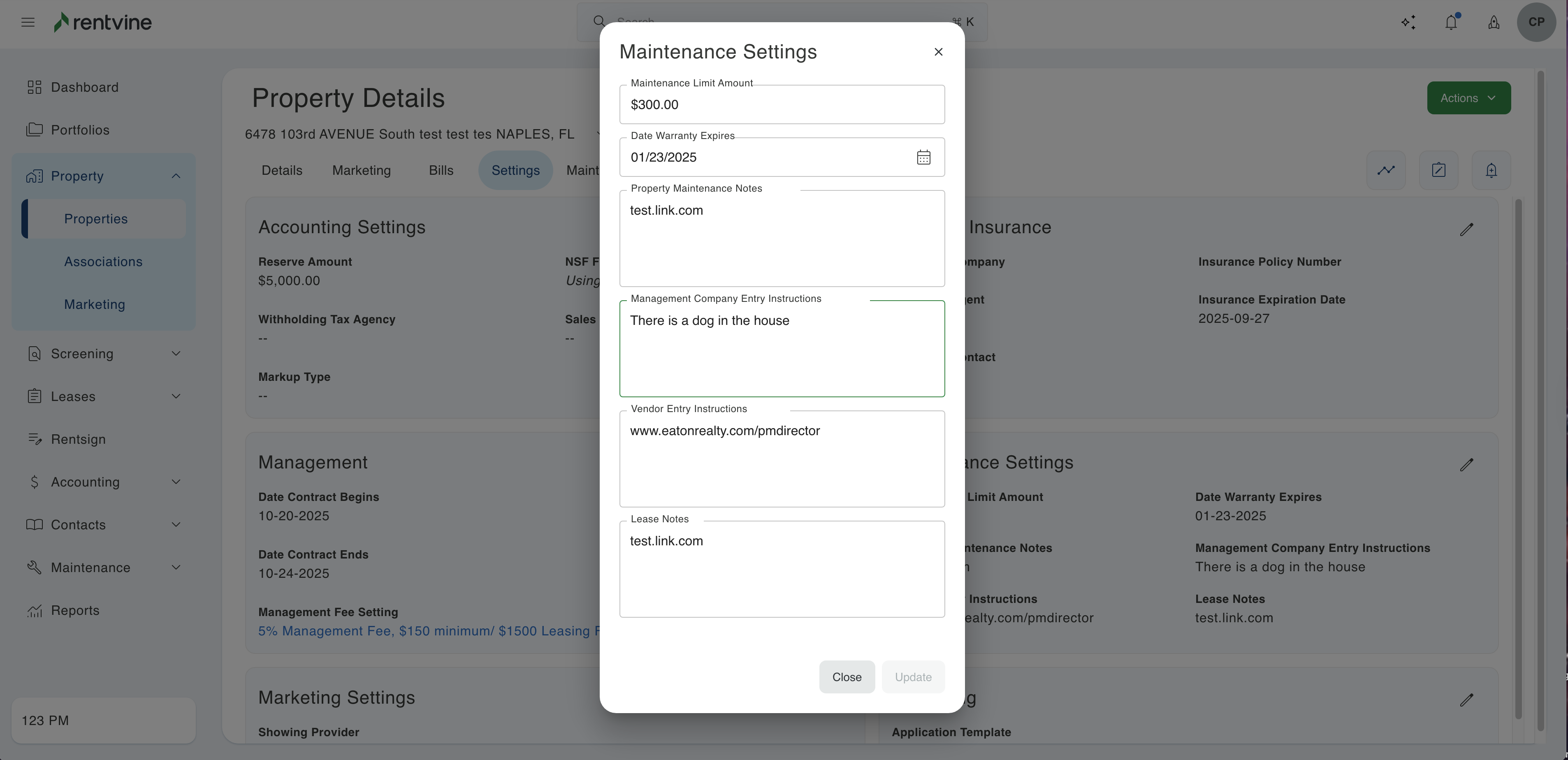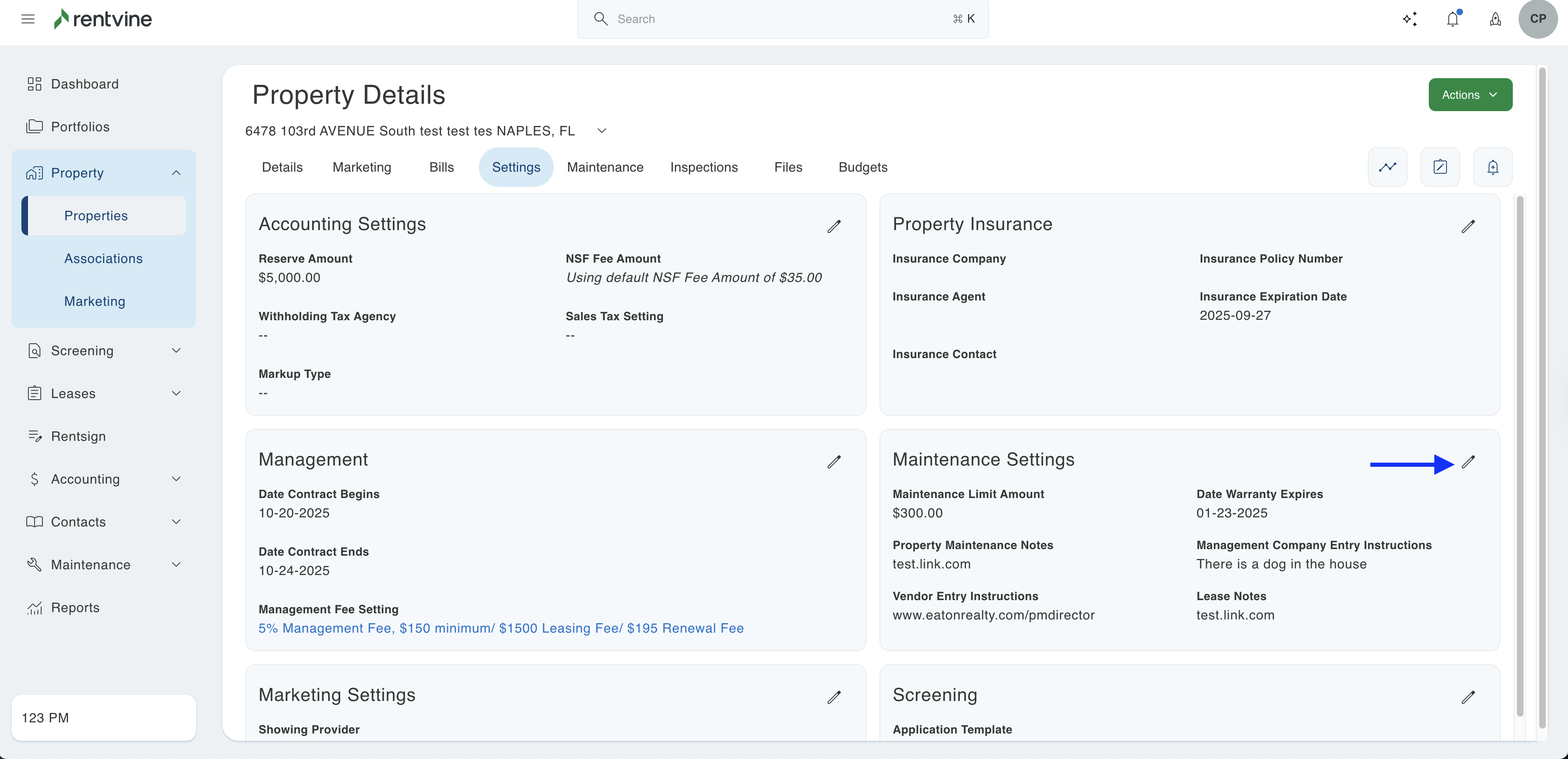 Maintenance Settings of a property are shown as helpful information that you can be referenced when creating or viewing a Work Order. Follow the steps below in order to change the maintenance settings on a property.