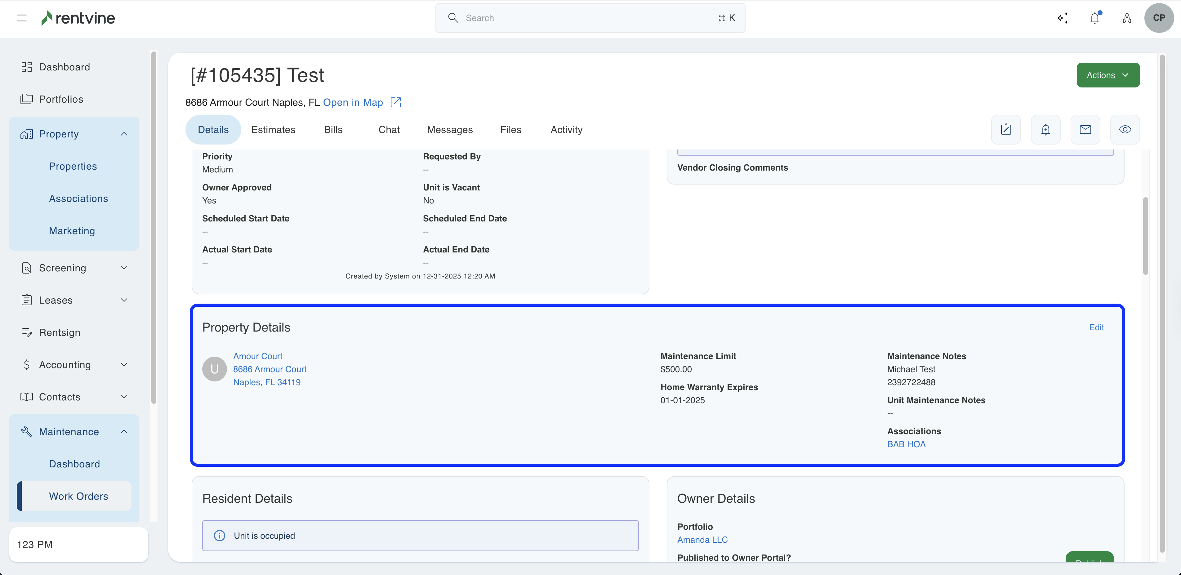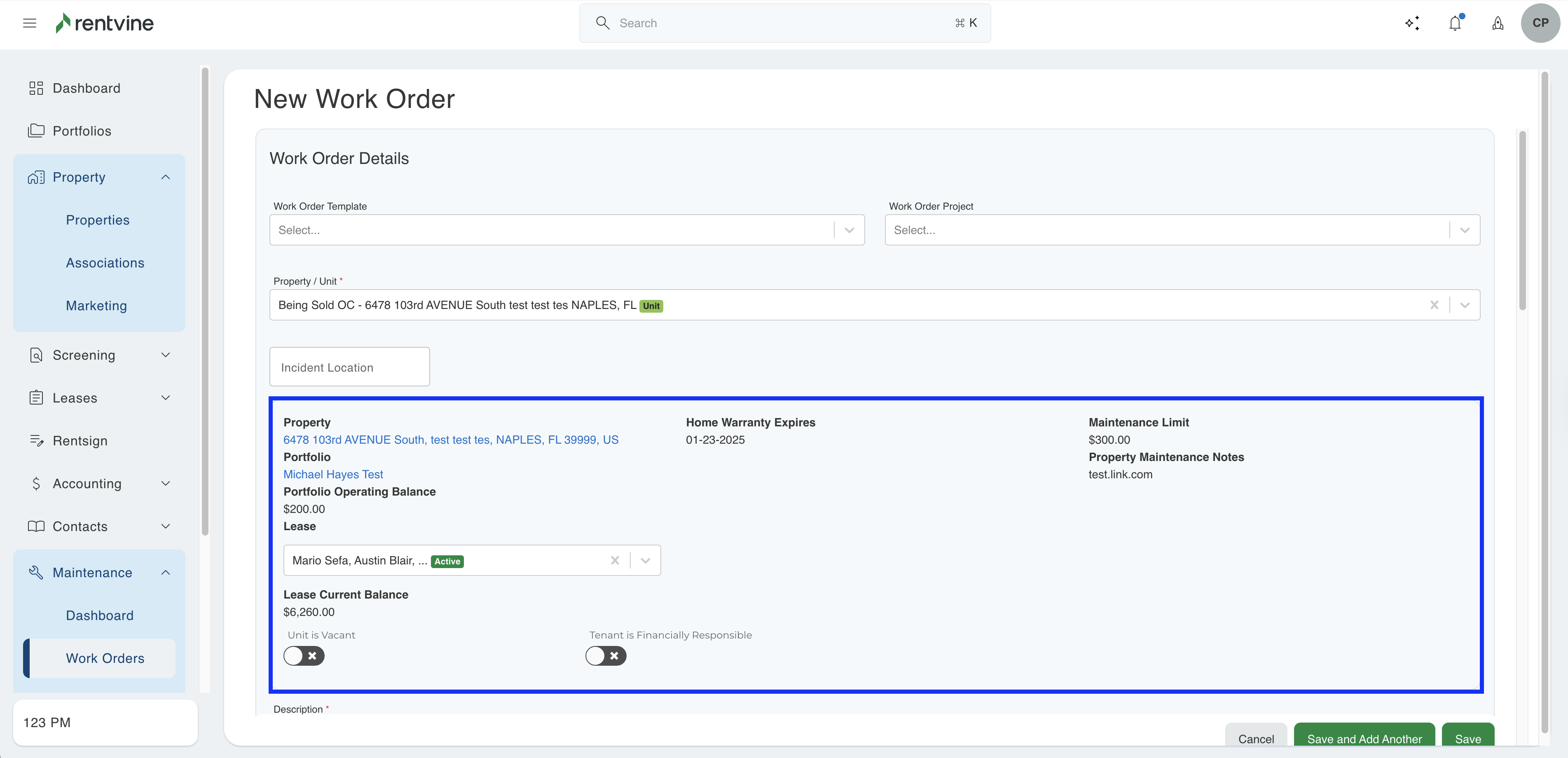 The Maintenance Settings will show when creating or viewing a Work Order for that property.