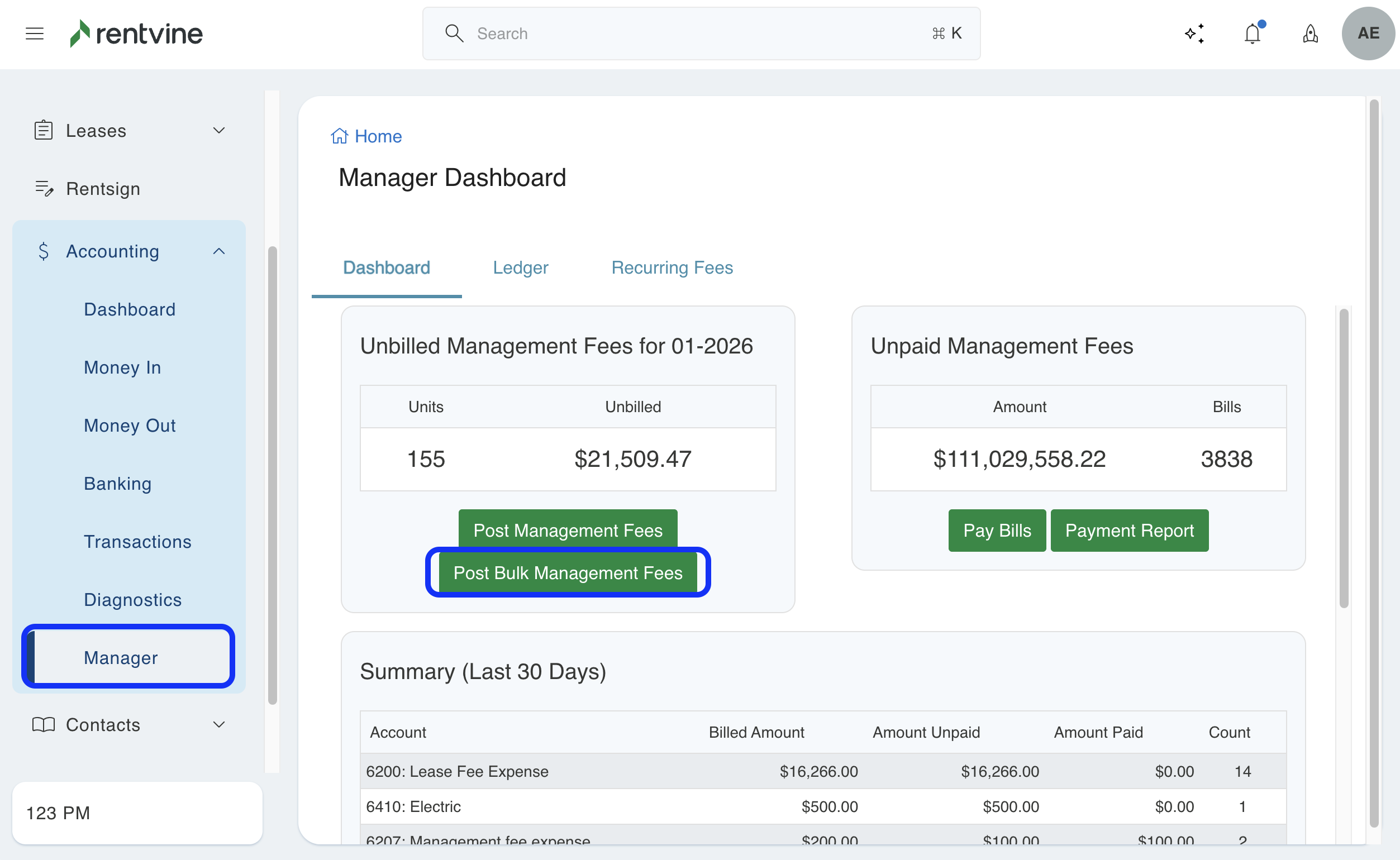 - From the left navigation menu, click on Accounting, then from the dropdown menu, click on Manager.