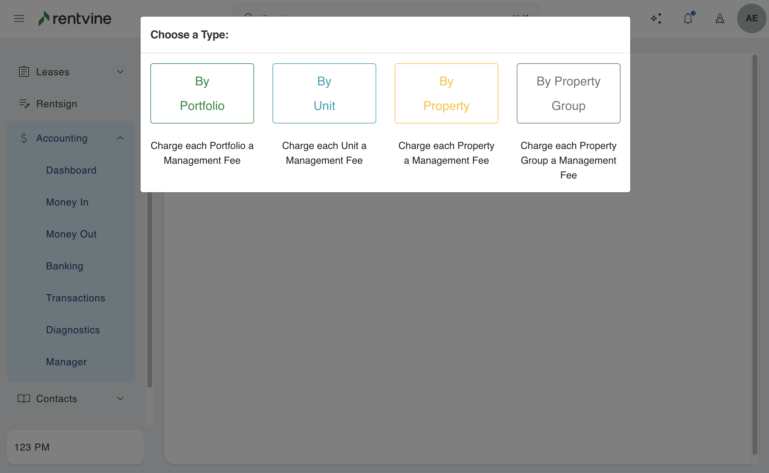 - Choose a type - What type do you want to charge this fee? Portfolio, Unit, or Property