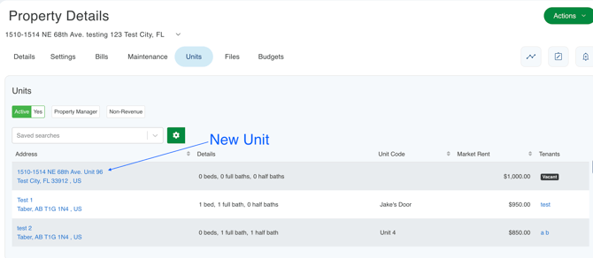 To view a newly created unit under a property: