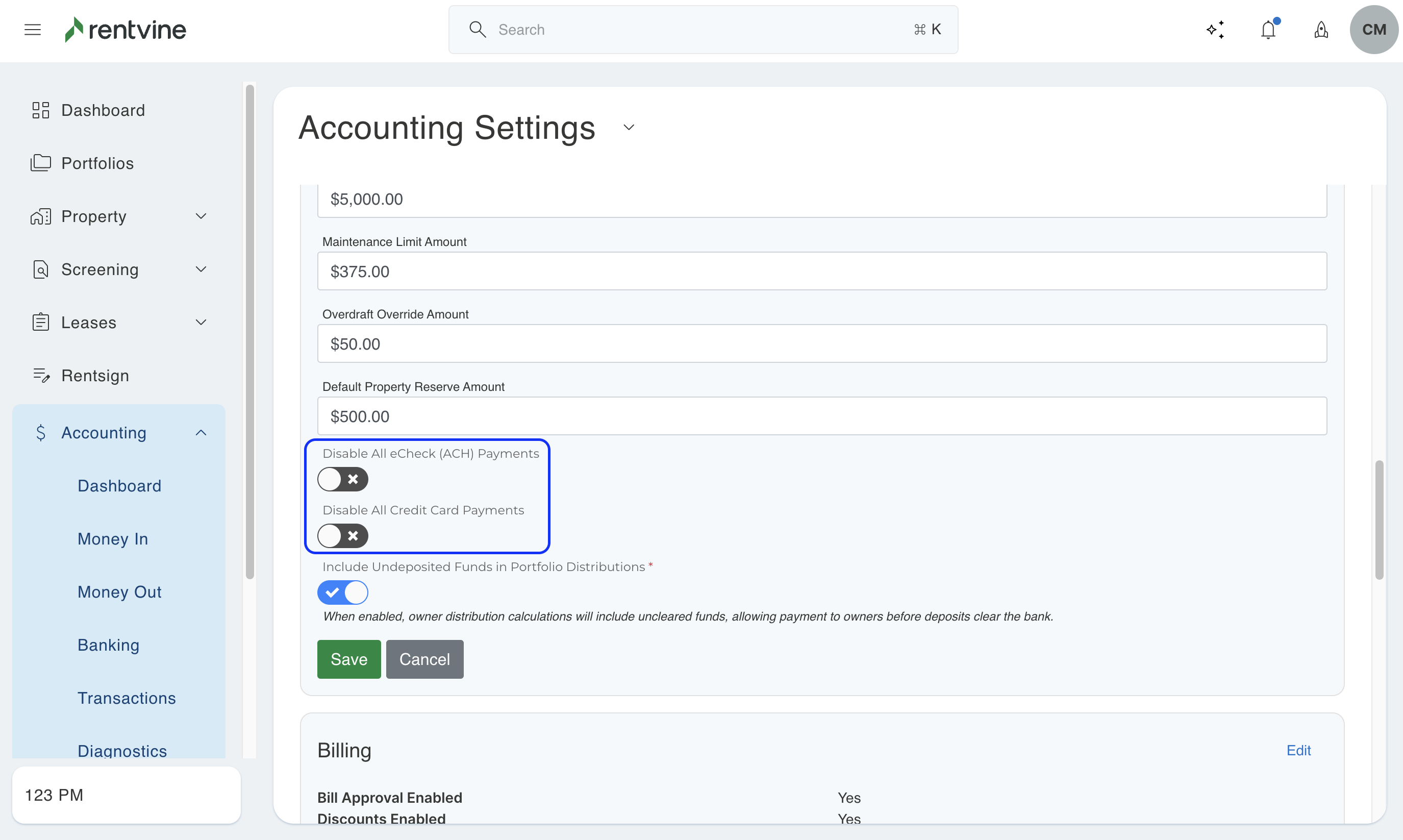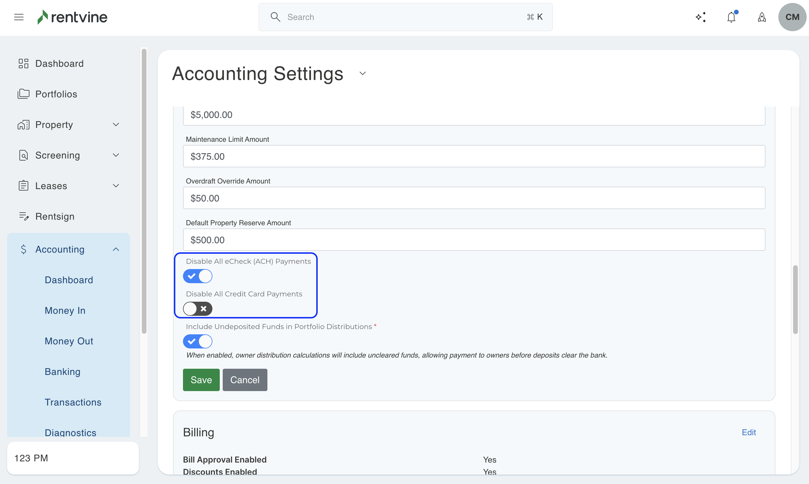 Enabling/disabling these toggles will affect all of the owner portals within your Rentvine account. This will be when an owner logs in and is going to make a contribution through their portal. If both toggles are on, they will see the option to pay via CC or ACH. You can toggle both off or a single one off by following this article.