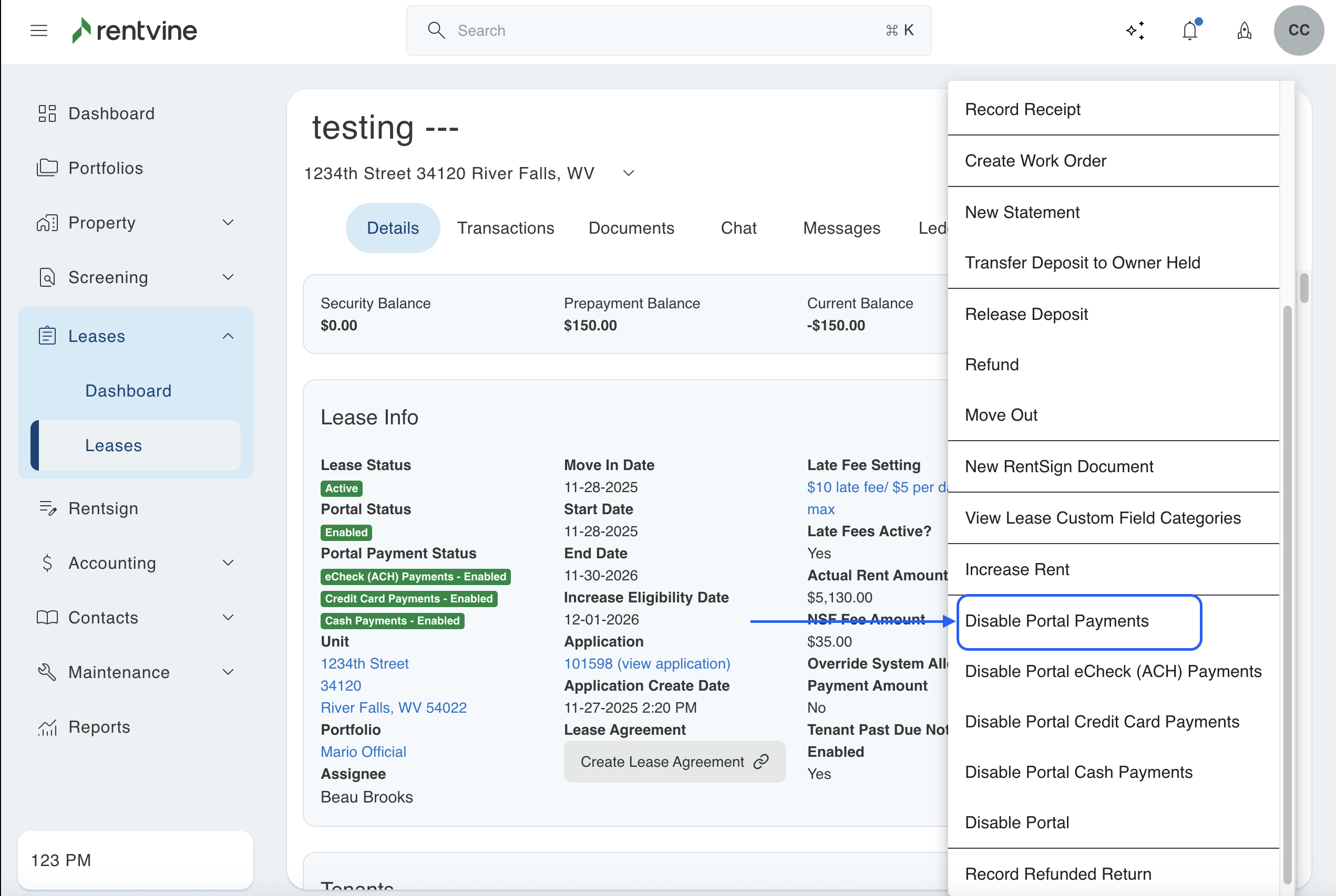 - Select the lease you want to disable/enable tenant portal payments for.