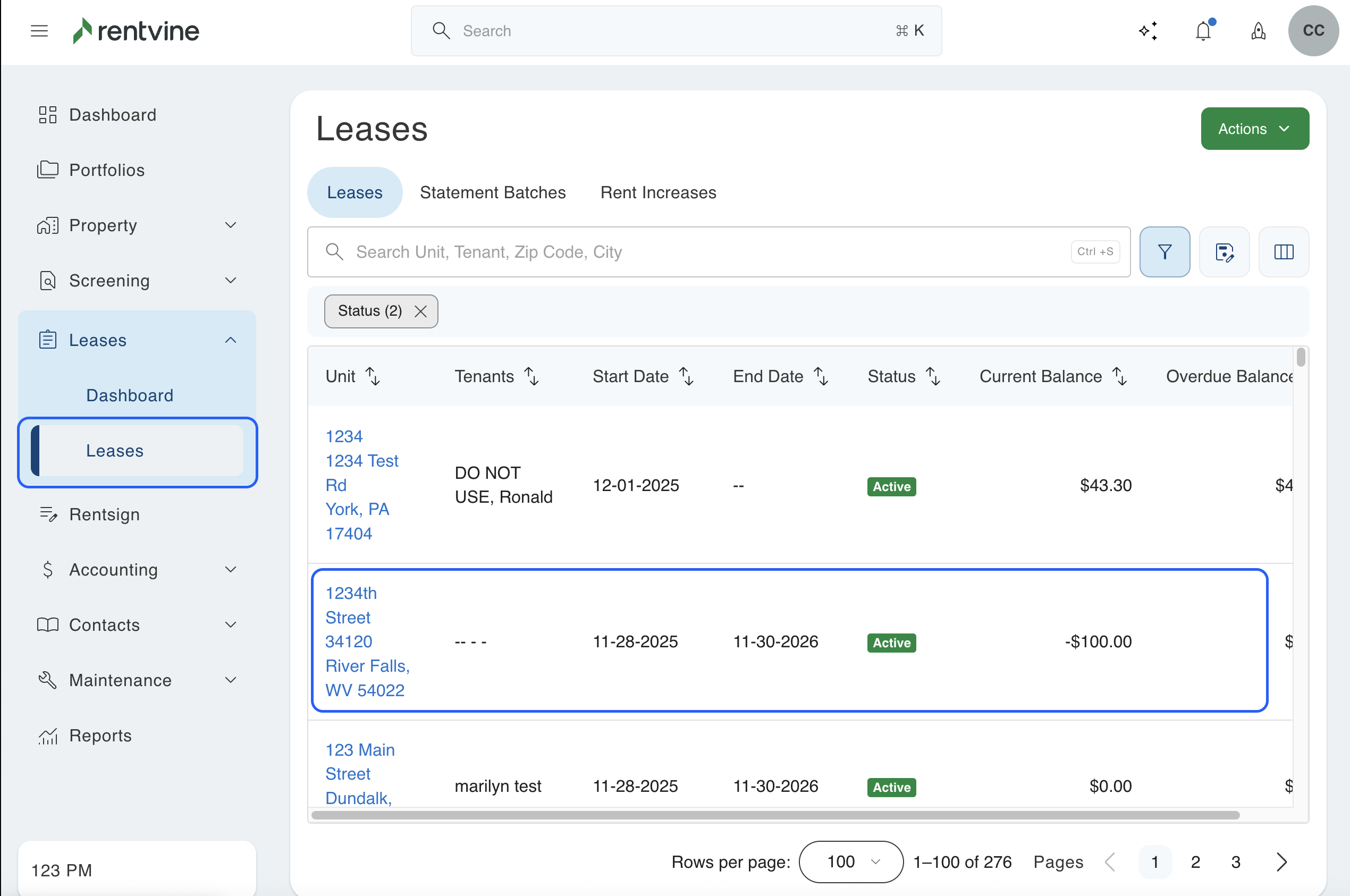 1. Click on the tab labeled "Leases" on the left side of the screen. This will pull up a list of all the leases you have. Next, you will search for the specific lease with the charge you need to edit. You will then click on that row to view the lease