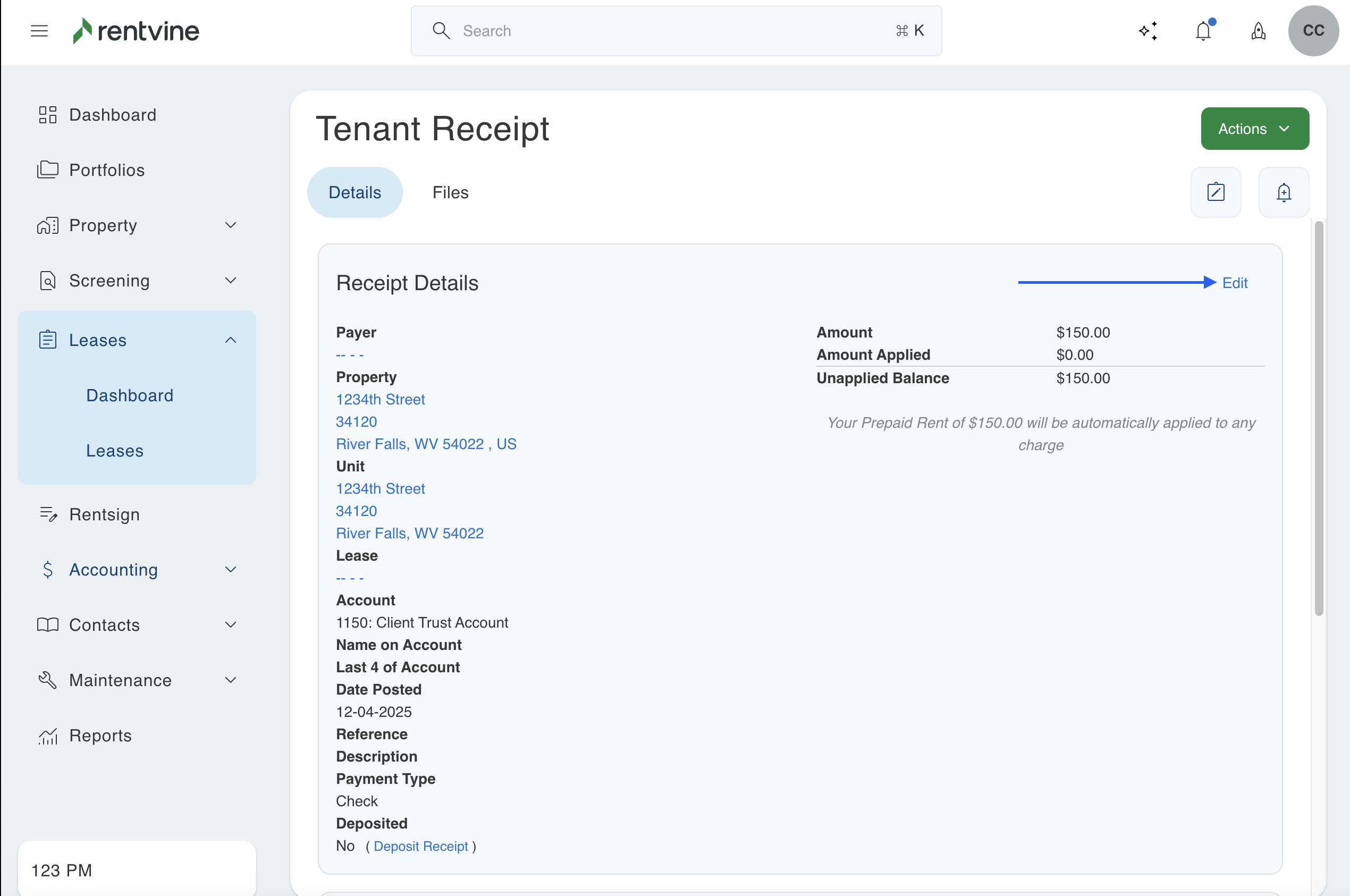 3. This will bring up that specific payment on this lease. You will then look in the box labeled "Receipt Details". In the top right of this box, you will click edit.