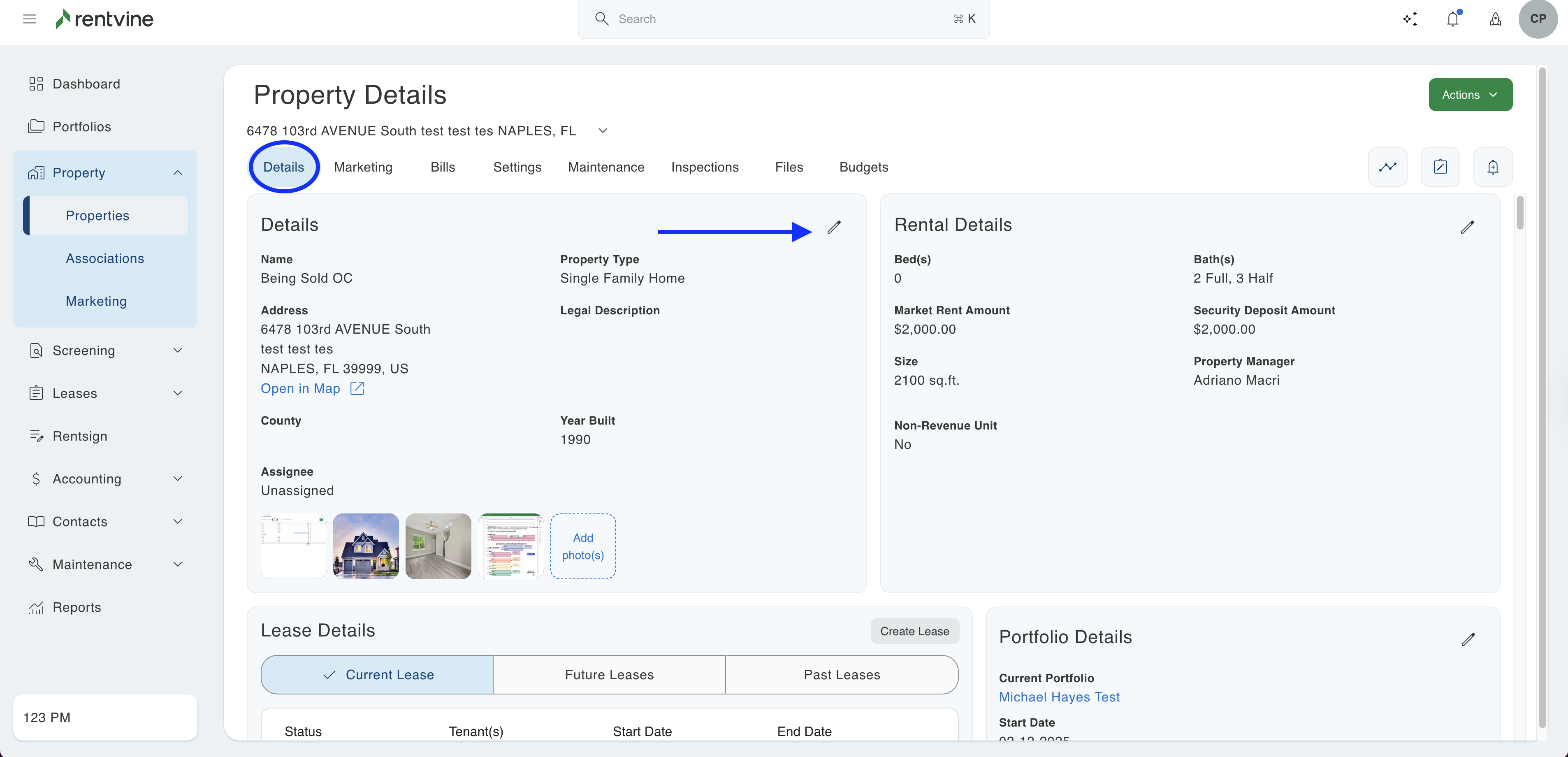 The first step is to click on the "Property" tab on the left side of the screen, then click "Properties". Then you will need to select the property you want to edit the address of. Once selected, you will look in the "Details" tab for a box called "Details". In the top right of the box, you will click the pencil icon button.