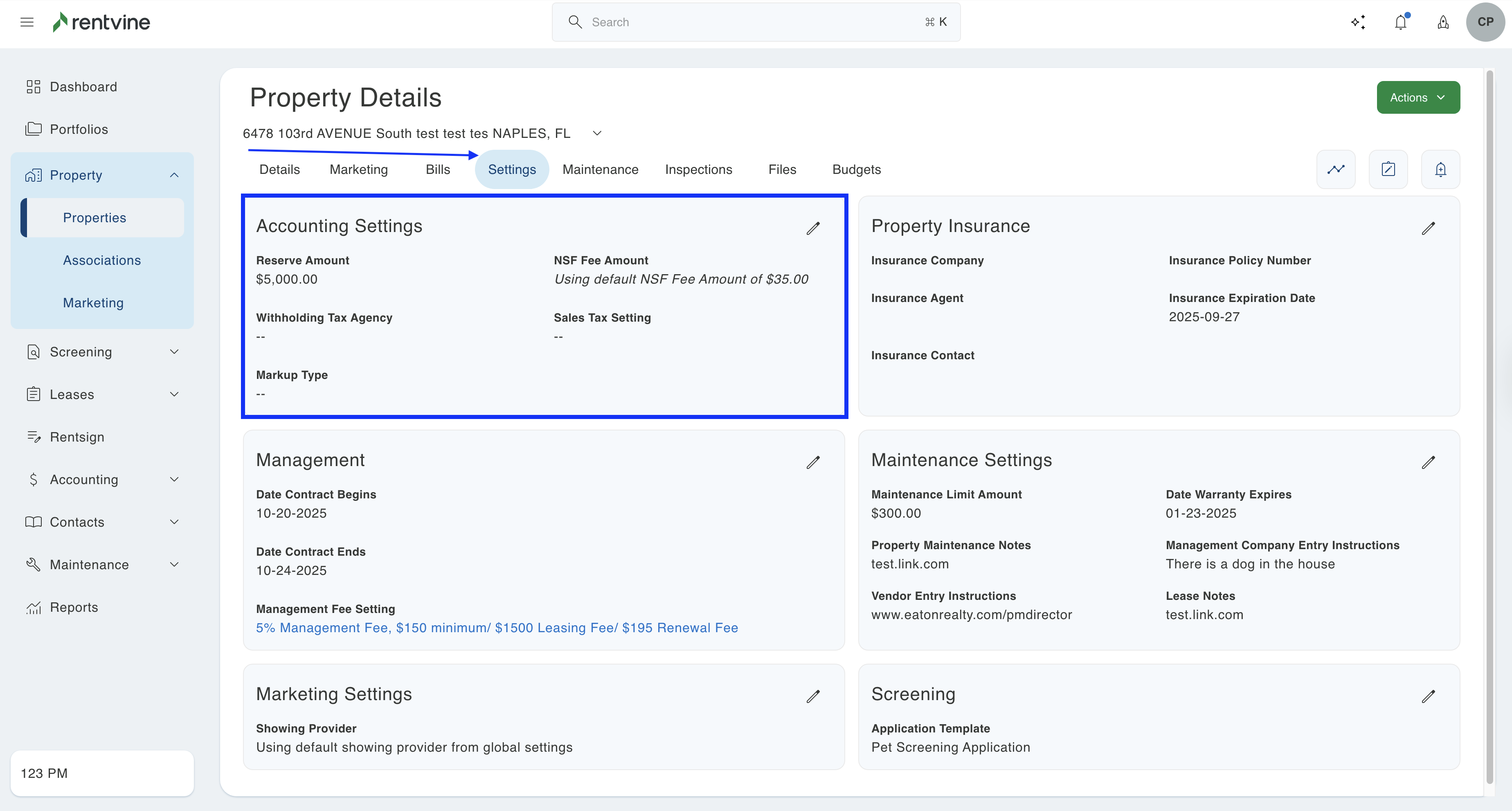 3. The next step is to go into the settings tab inside of that property. In this section you will see a box labeled "Accounting Settings". In the top right of this box you will click the pencil icon.
