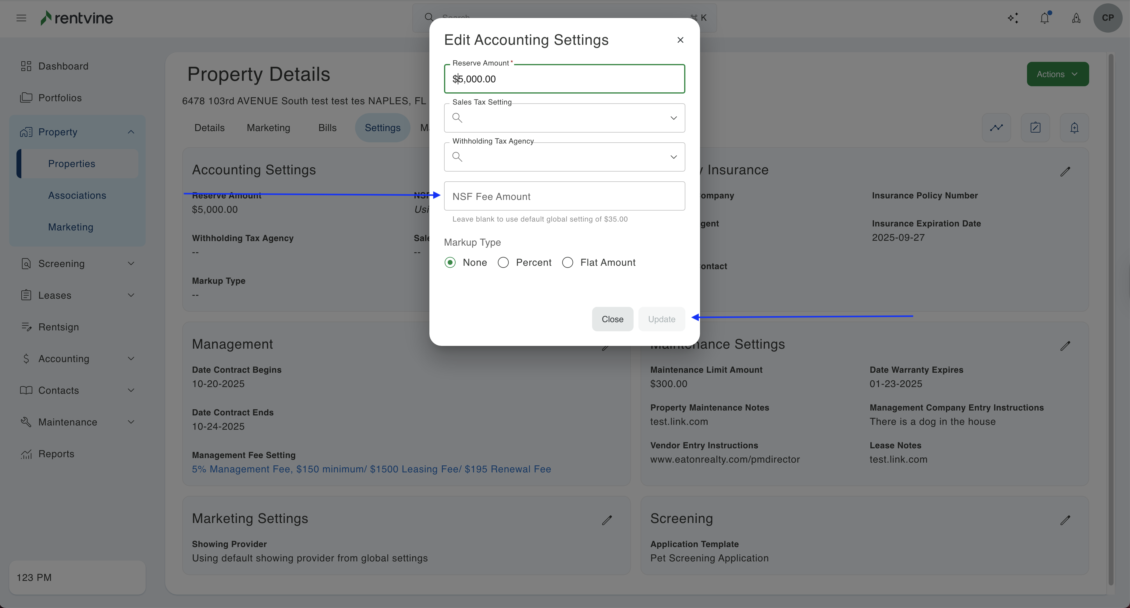 NOTE: When the NSF fee amount is defined here it will override the NSF fee in the global settings. The NSF fee amount on a property or unit is used as the default NSF fee when creating a lease (Move In)