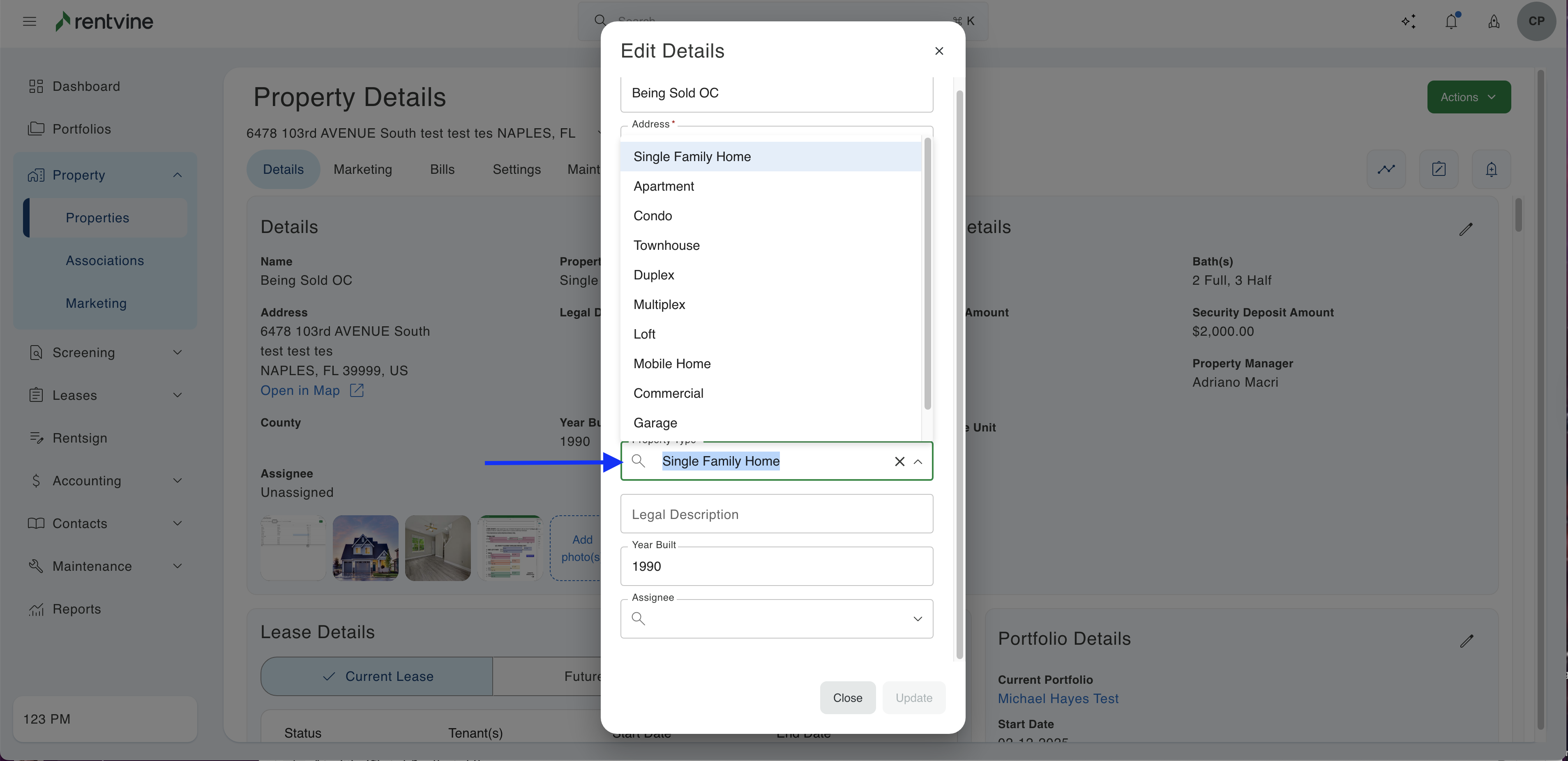 Once you click edit a sidebar will pop out with different options. You will look for the "Property Type" dropdown box and select the correct property type for this property (i.e. Single Family Home, Condo, Apartment, etc.). When you are done click on the green Update button at the bottom of the sidebar to save changes.
