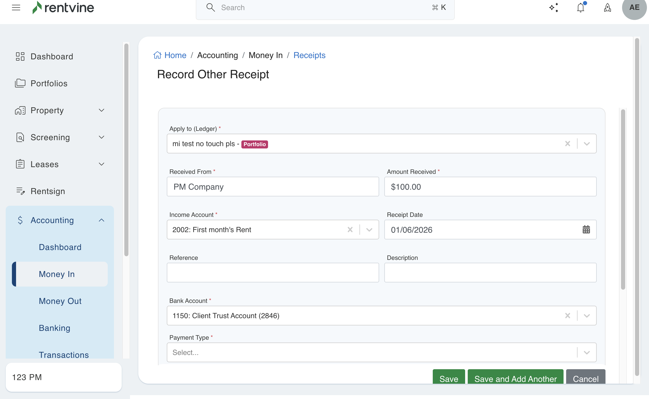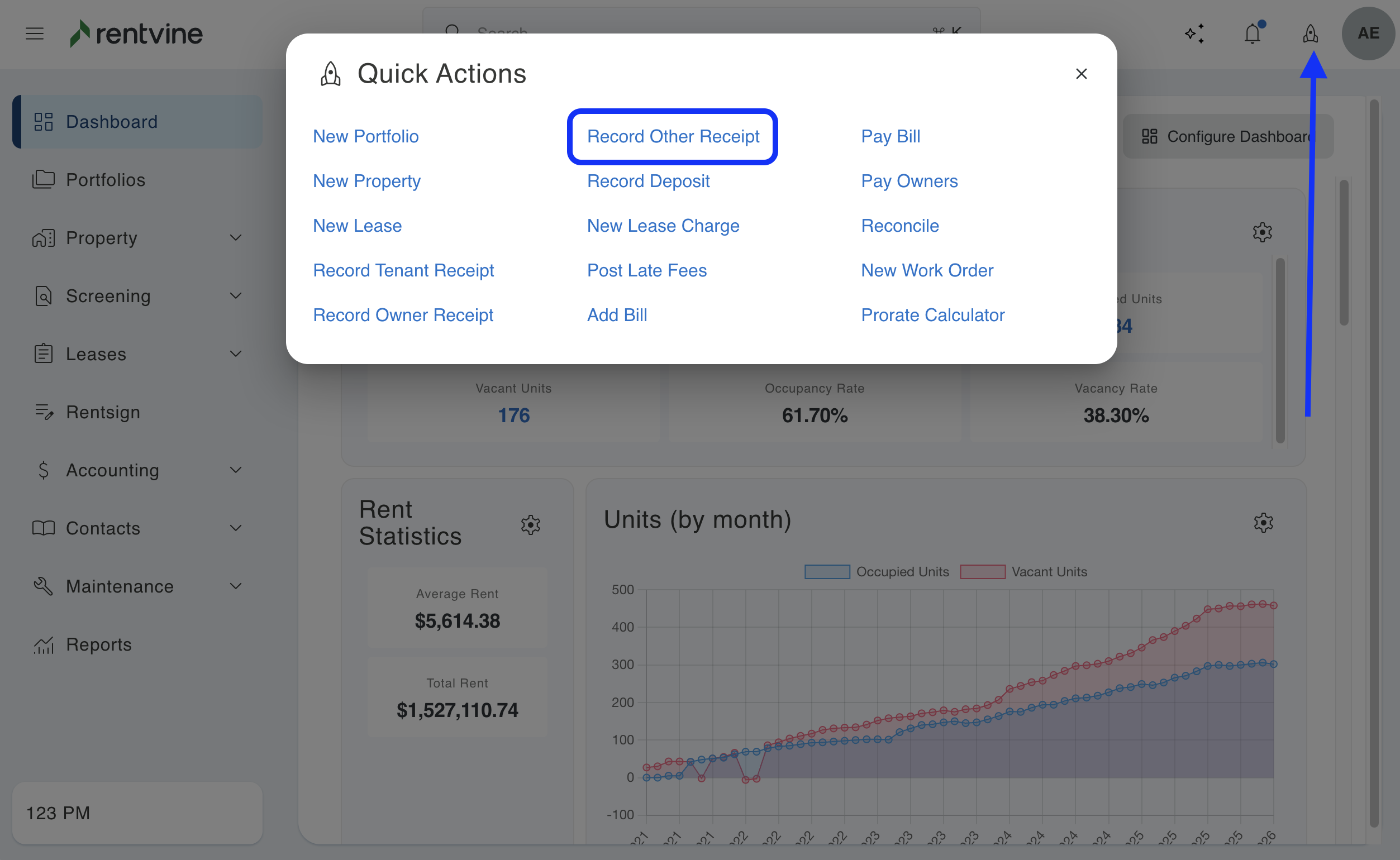 This article will walk you through how to record an Other Receipt in Rentvine. This option is typically used to manually record funds being added to a owners ledger outside of a tenant payment.