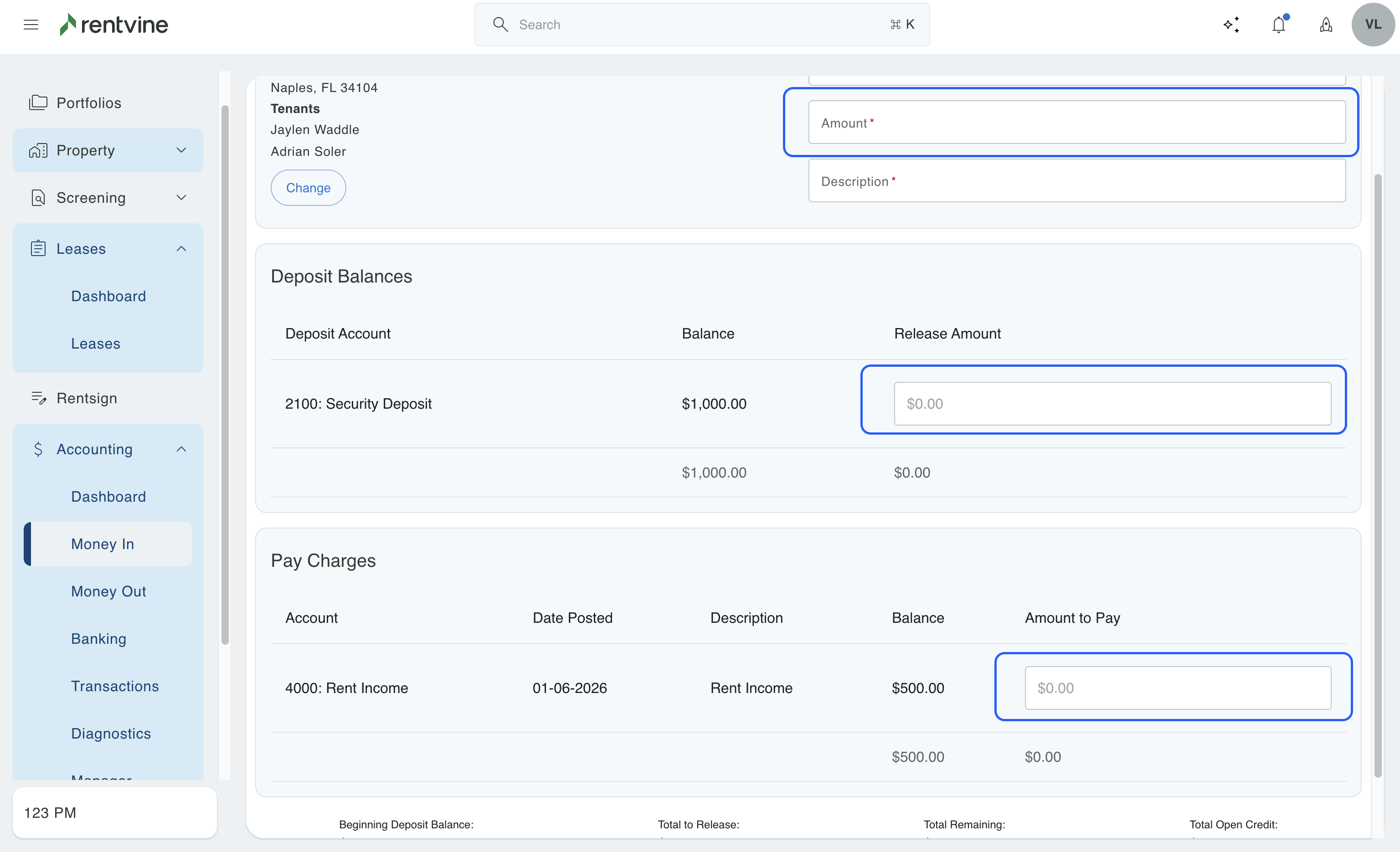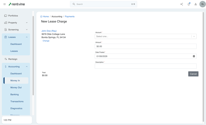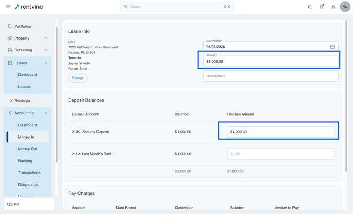 - While in the lease, add any charges to the lease that you need to first (ex., tenant damages)
