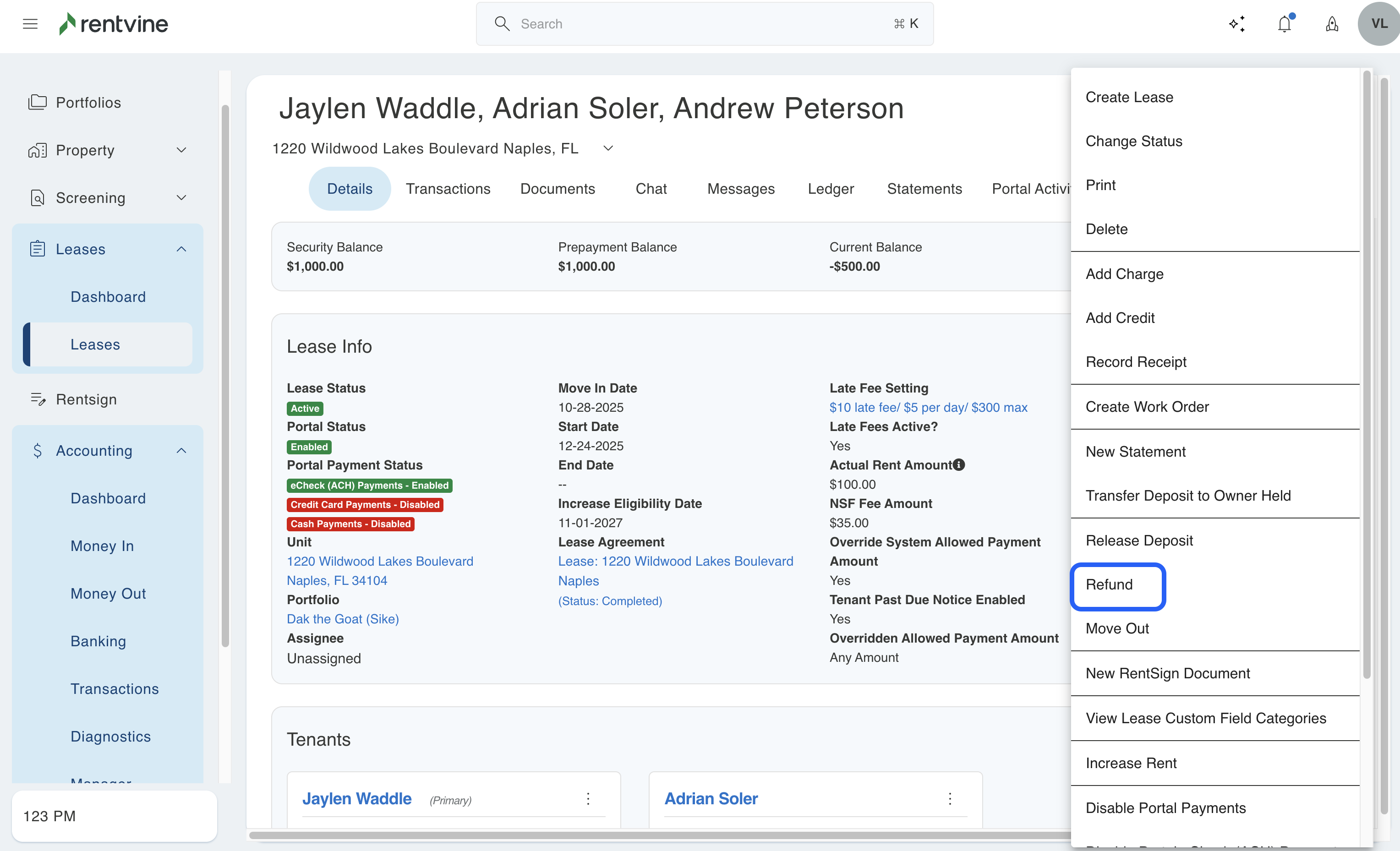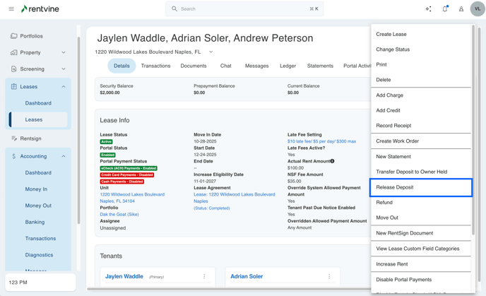 - Go to the specific lease that you would like to refund the security deposit