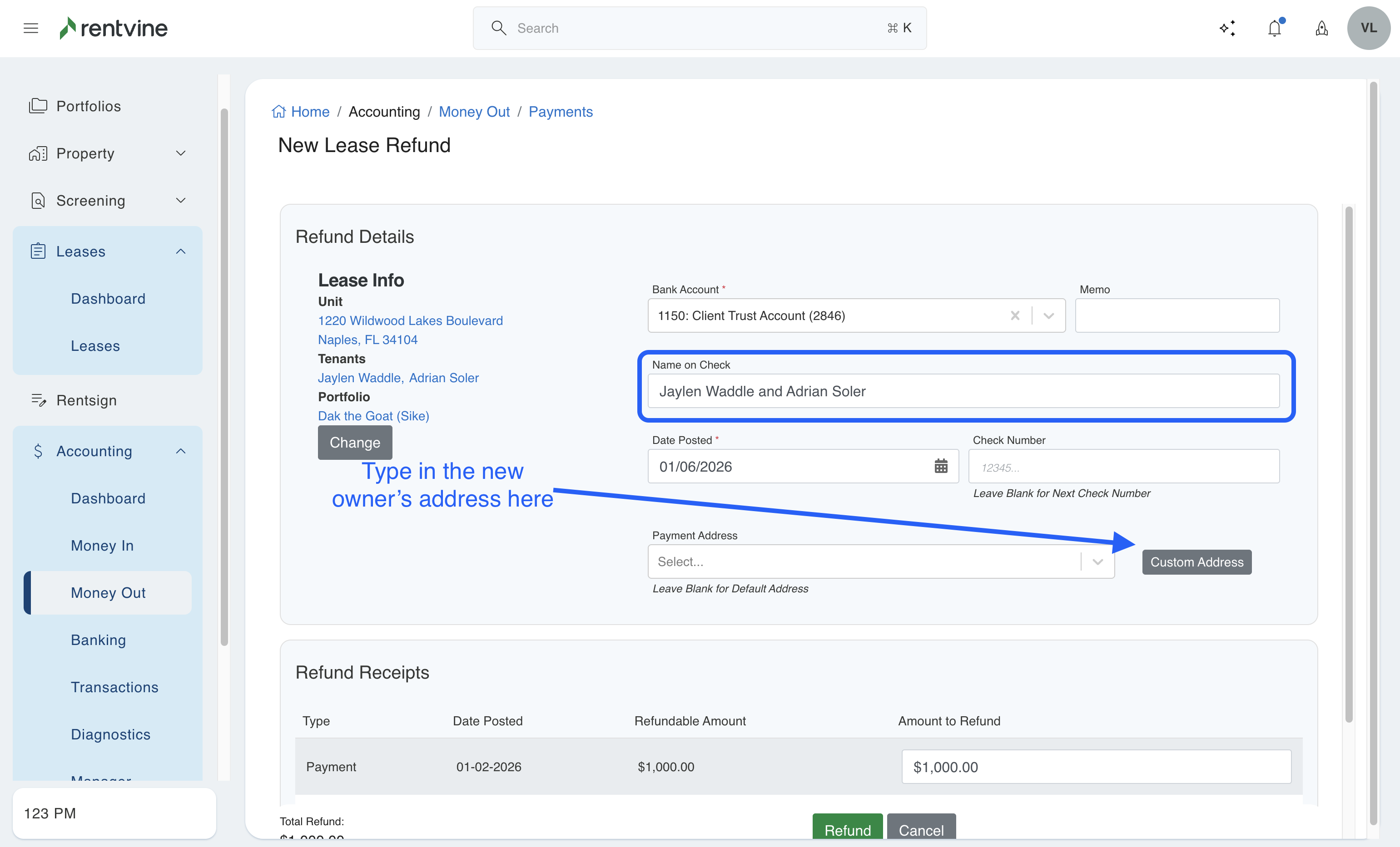 - For the Name on Check, overwrite the tenant's name and fill in the name of the new owner