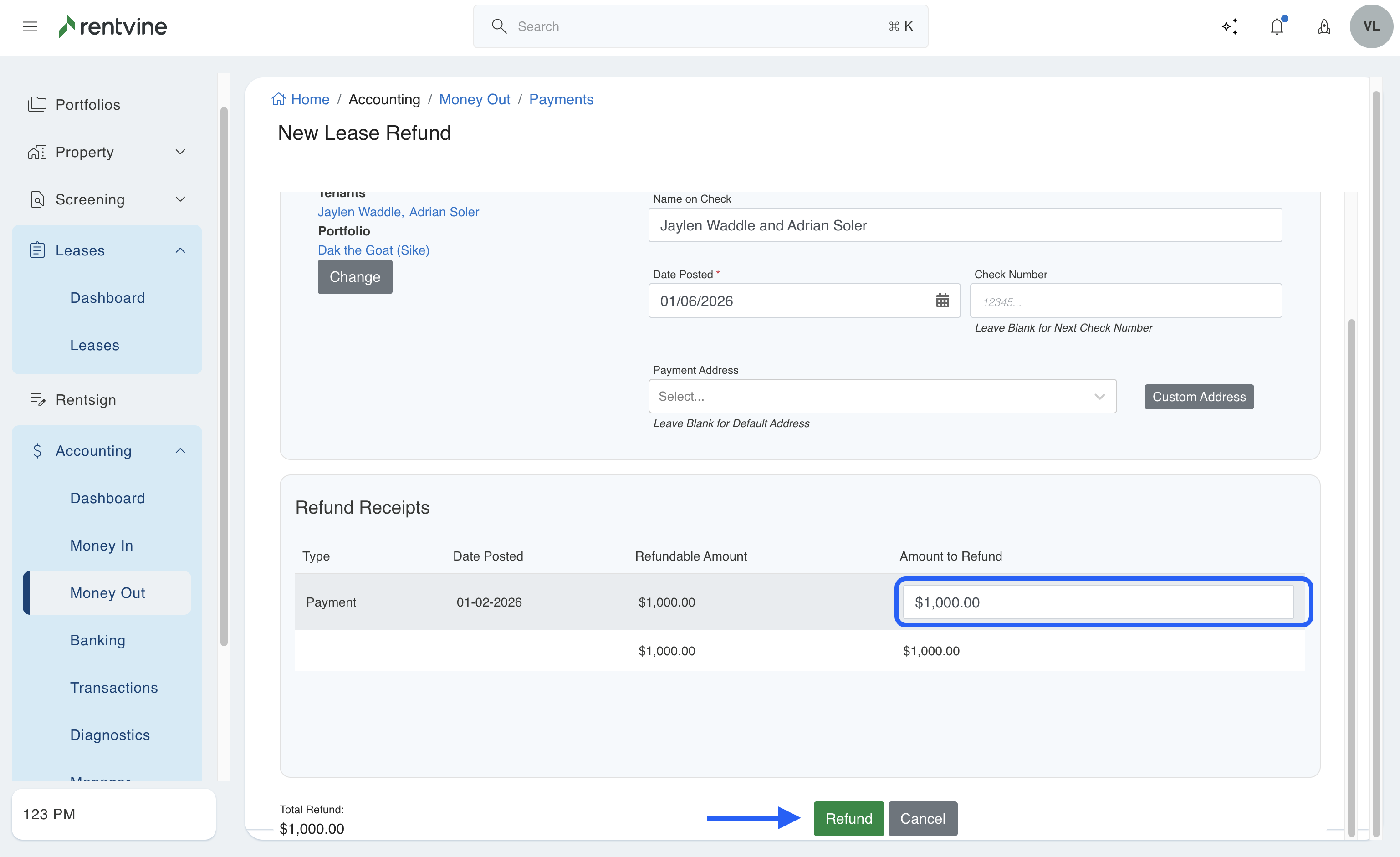 - The Bank Account will pre-fill to the Lease Refund account on that portfolio's posting setting, but this can be changed if needed