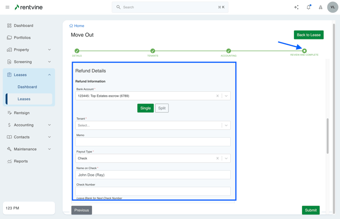 - This article will begin on the final step of the move-out when you are refunding the security deposit to the tenants. This will be located in the section labeled "Refund Details."