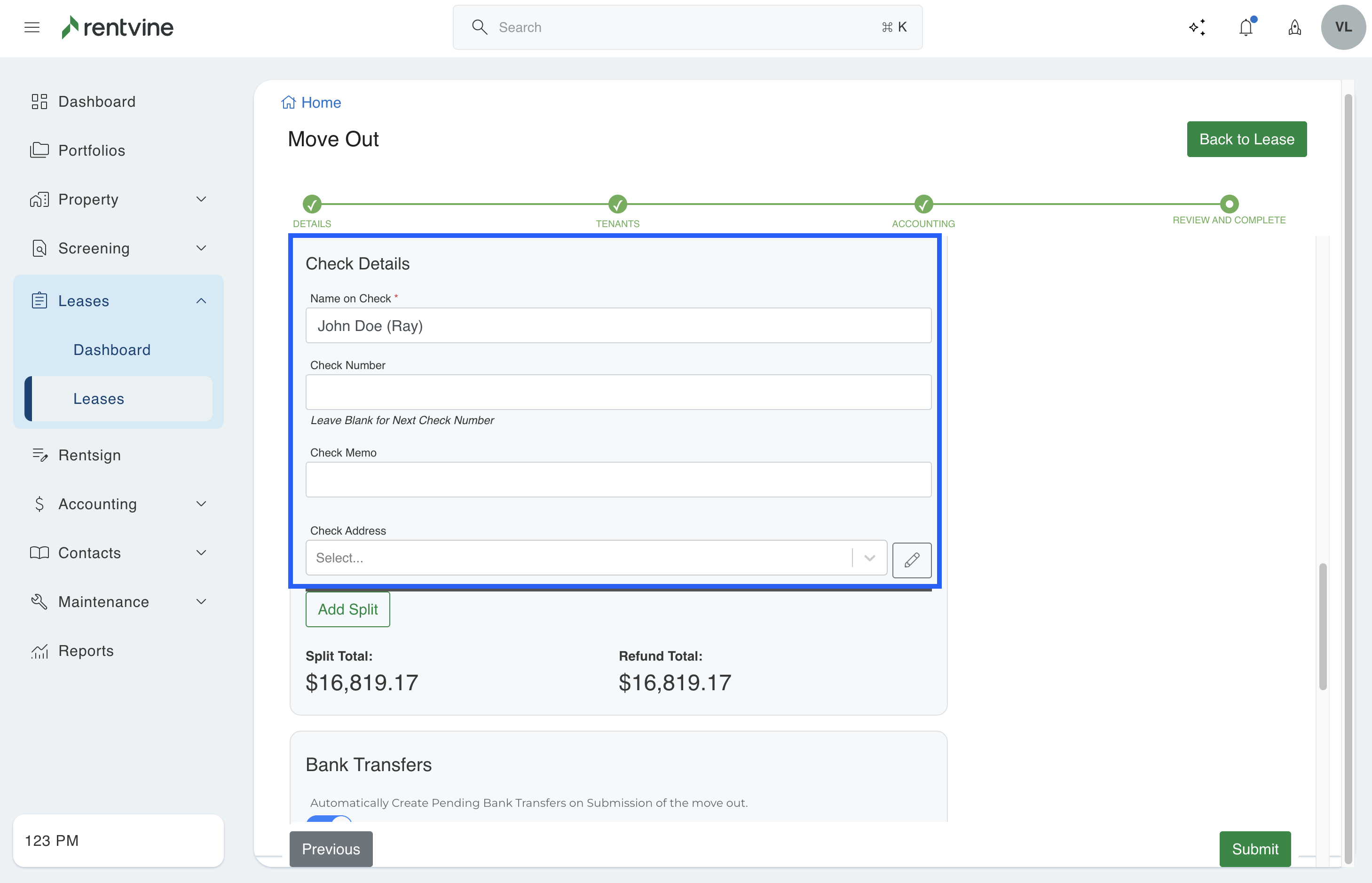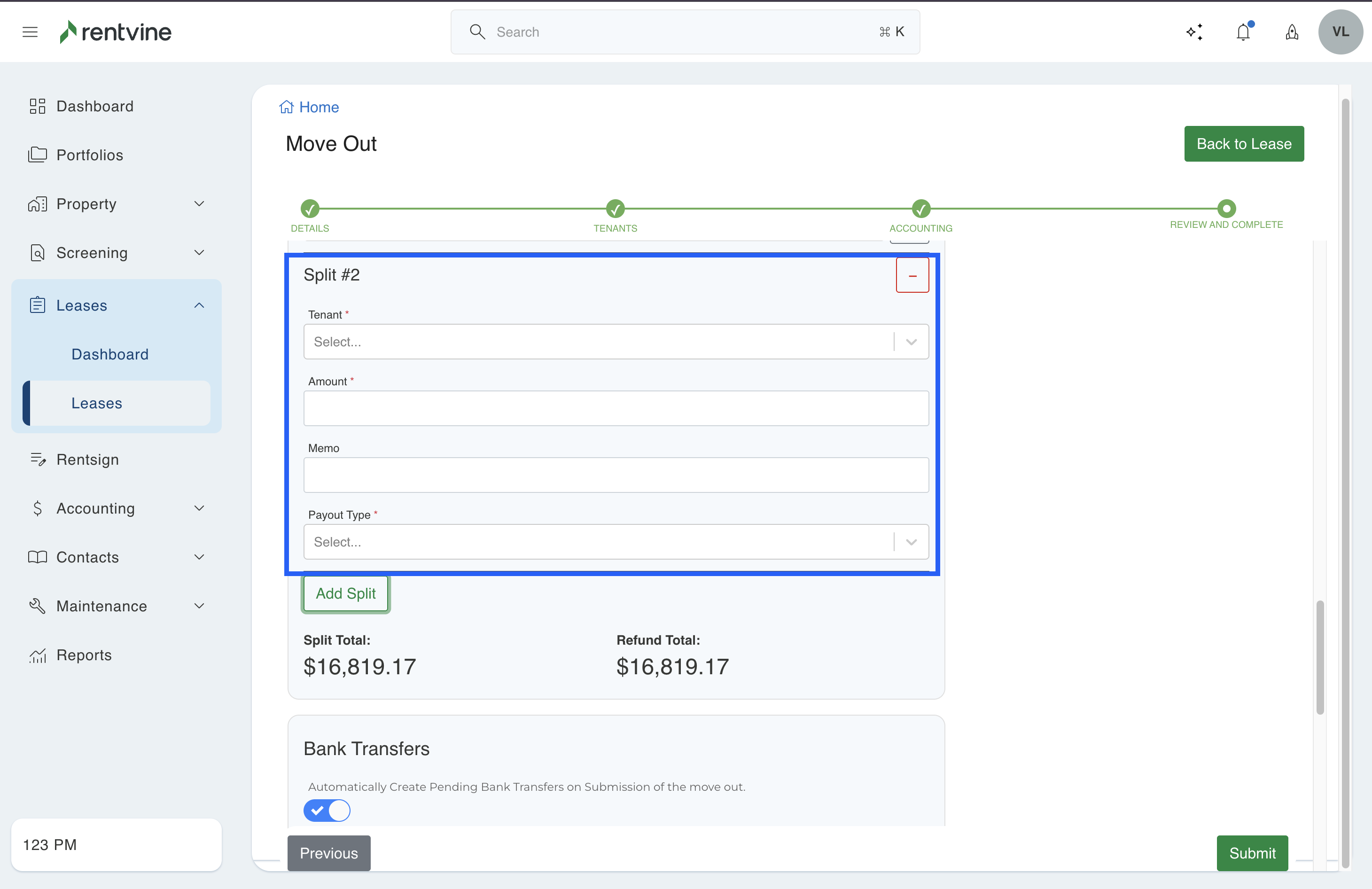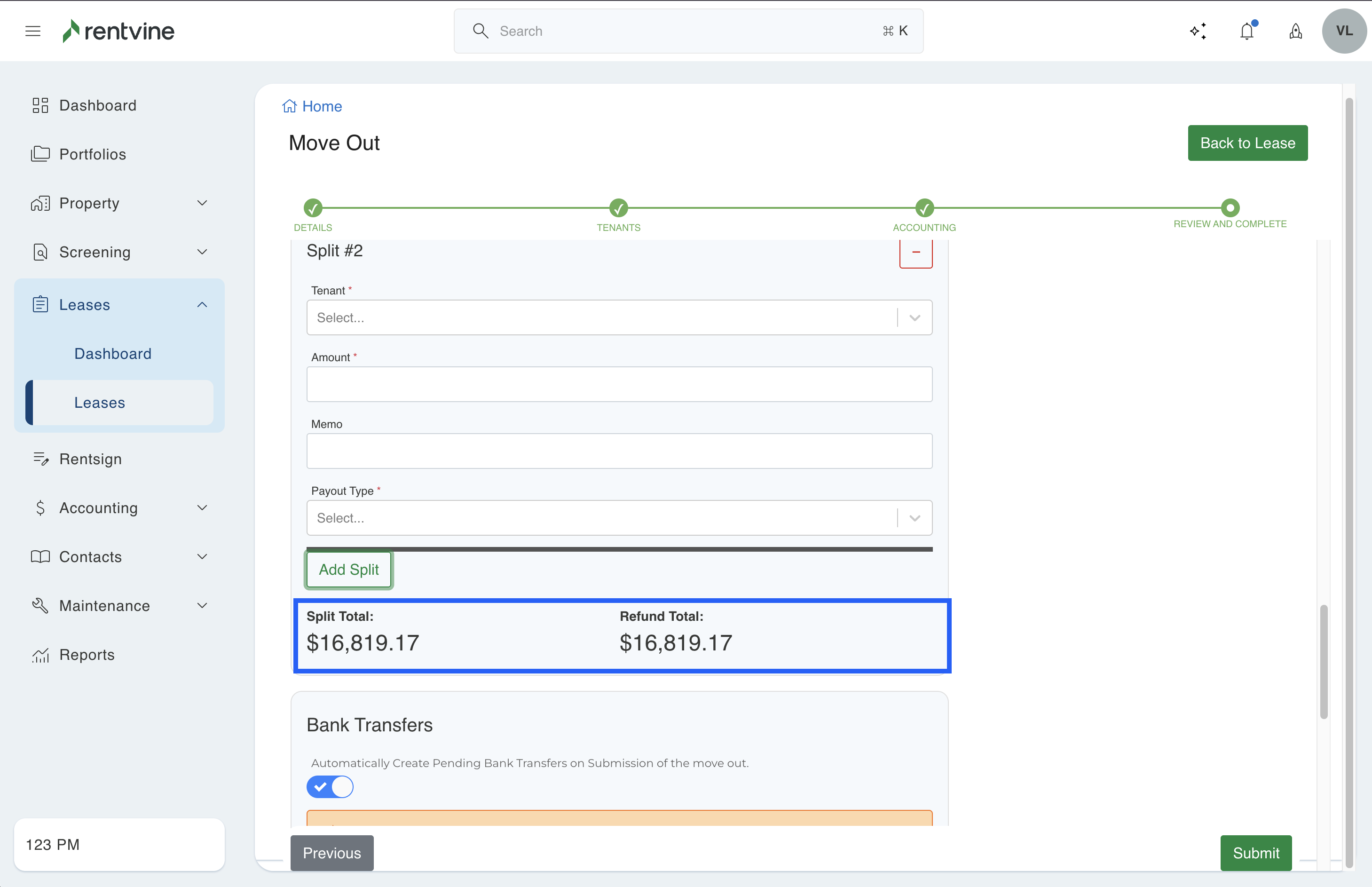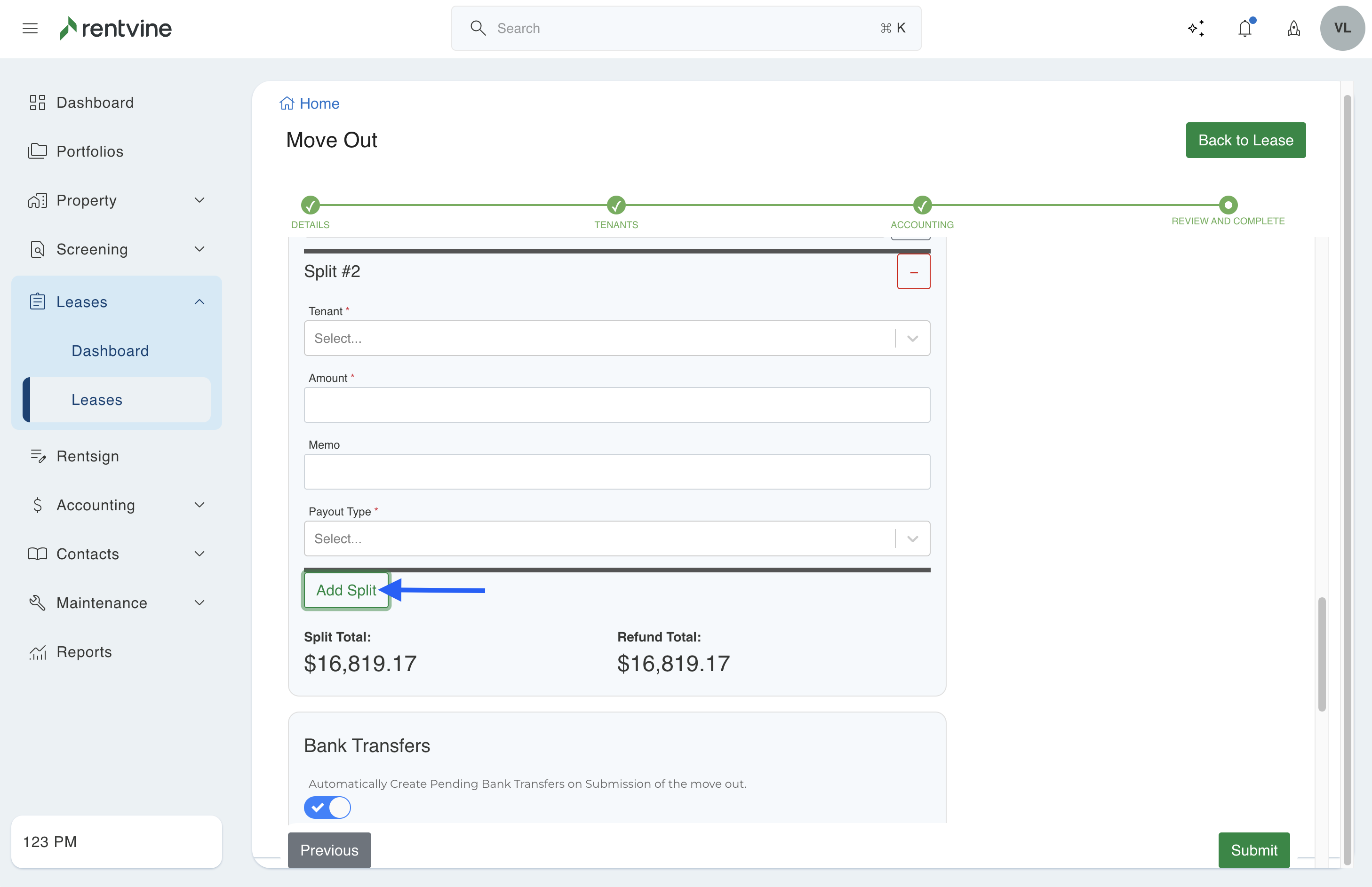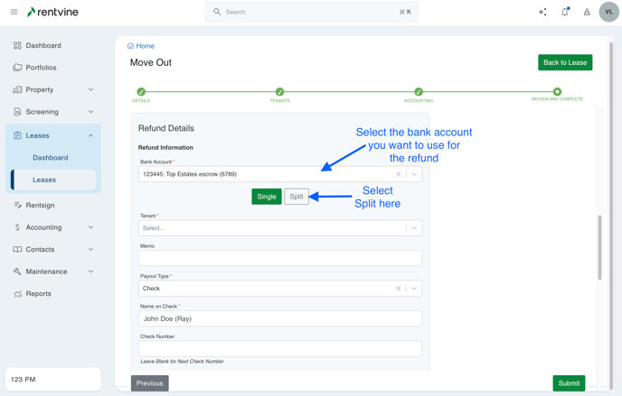Please note that there will automatically be the same amount of splits for the number of tenants you have attached to the lease. The amounts for the refund will also be evenly dispersed. For example if there are 4 tenants attached with a $1000 security deposit, there will be 4 splits with $250 attached to each tenant. You have the option to change the amounts of each split if you choose to.