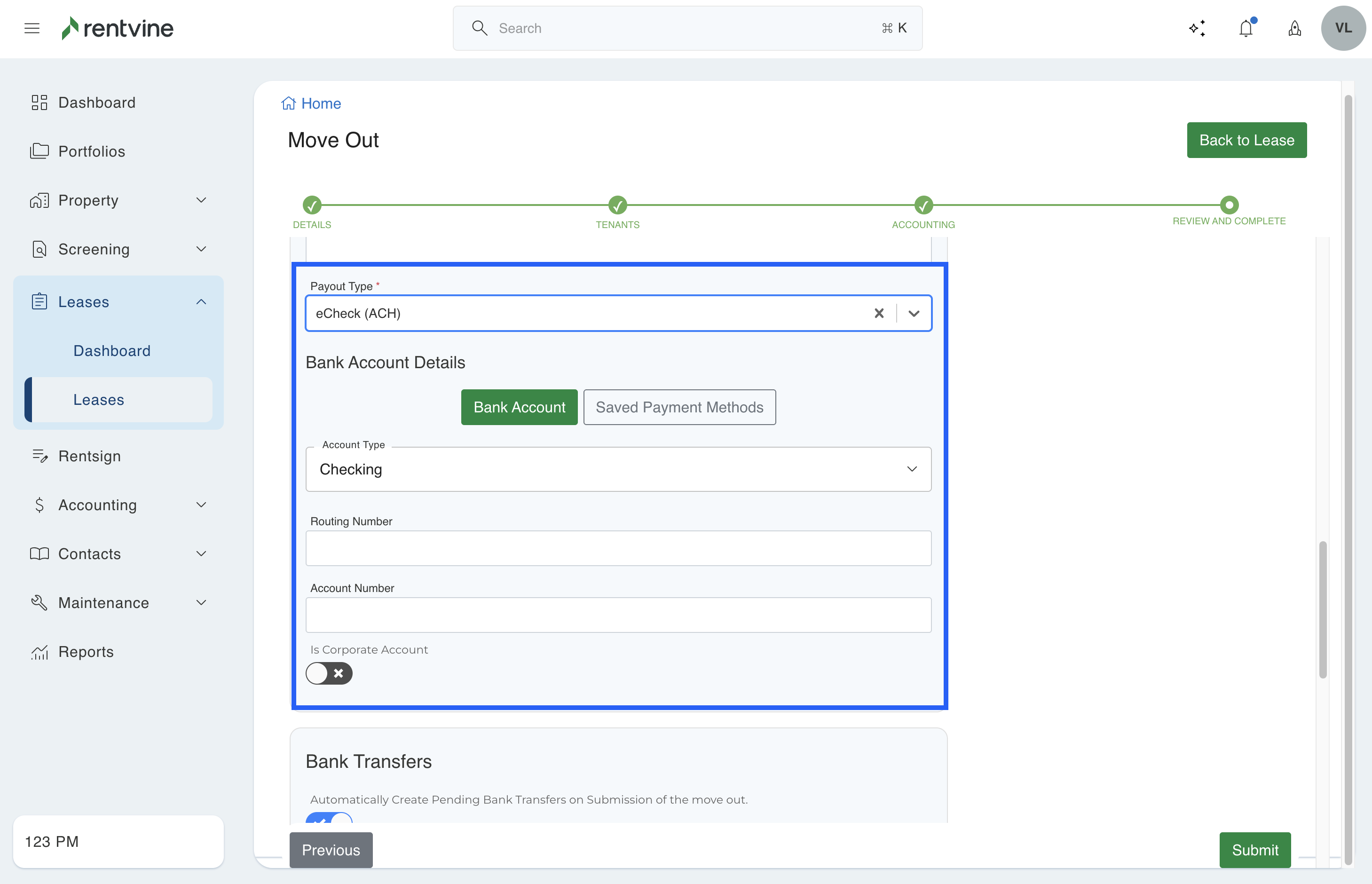 - Bank Account- this option allows you to manually enter the tenants bank account information to send the refund to