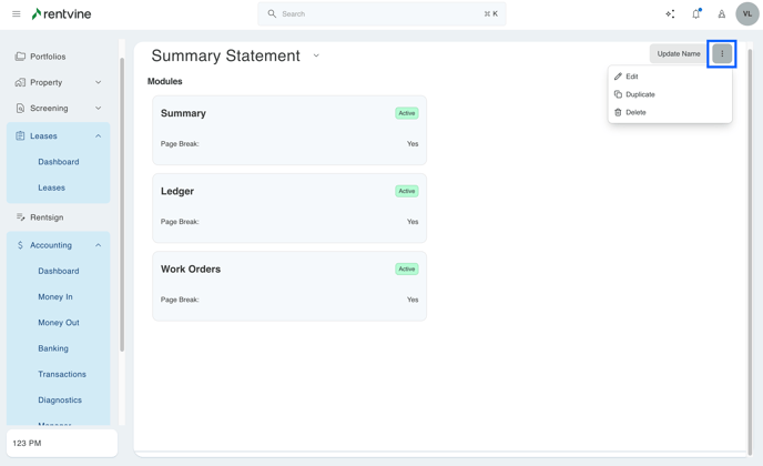 - To adjust the tenant statement, whether that is removing the page breaks or removing the summary, ledger, or work order section, you will want to select the ellipses at the top right of the page and select the edit option. You can also duplicate this statement setting or delete it from the setting page