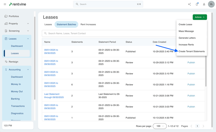 - First, you will want to go to the leases page in Rentvine, where you will see the statement batches selection. In this page, you will be able to generate these tenant statement batches, as well as view previously generated batches for your tenants.