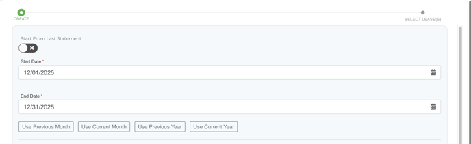 The Start Date and End Date will automatically fill based on the Accounting start date from your settings. You can override these dates, or use the quick-select buttons under the date fields to change the period or year. The dates you choose will determine the reporting period for the tenant statement.