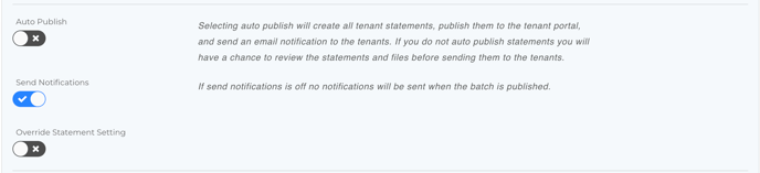 - The Override Statement Setting toggle will also be off by default. Leaving this off means each tenant statement will use the statement setting already assigned to each tenant. If you turn it on, you can choose a different tenant statement setting that will apply to all tenant statements being sent/published.