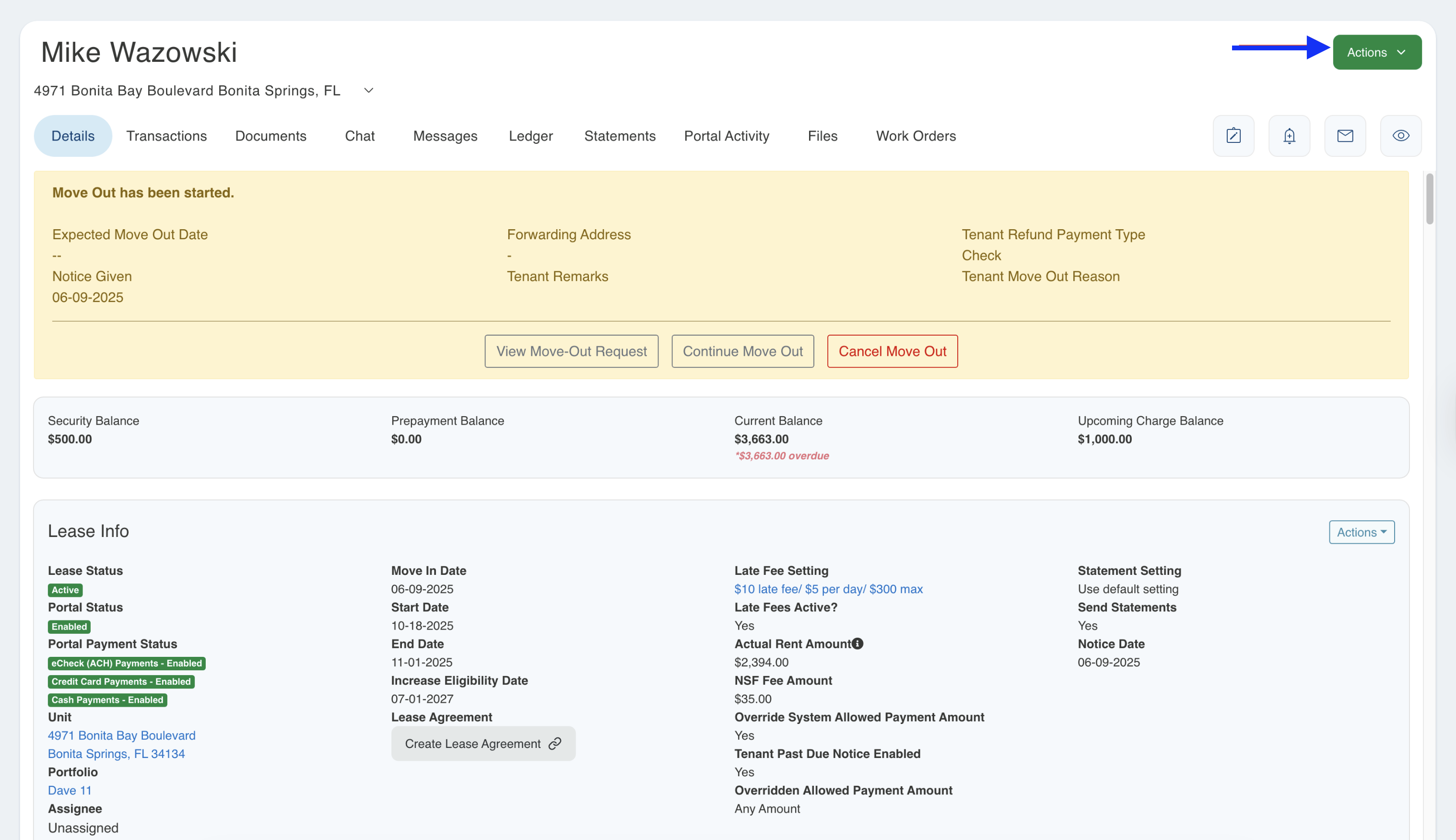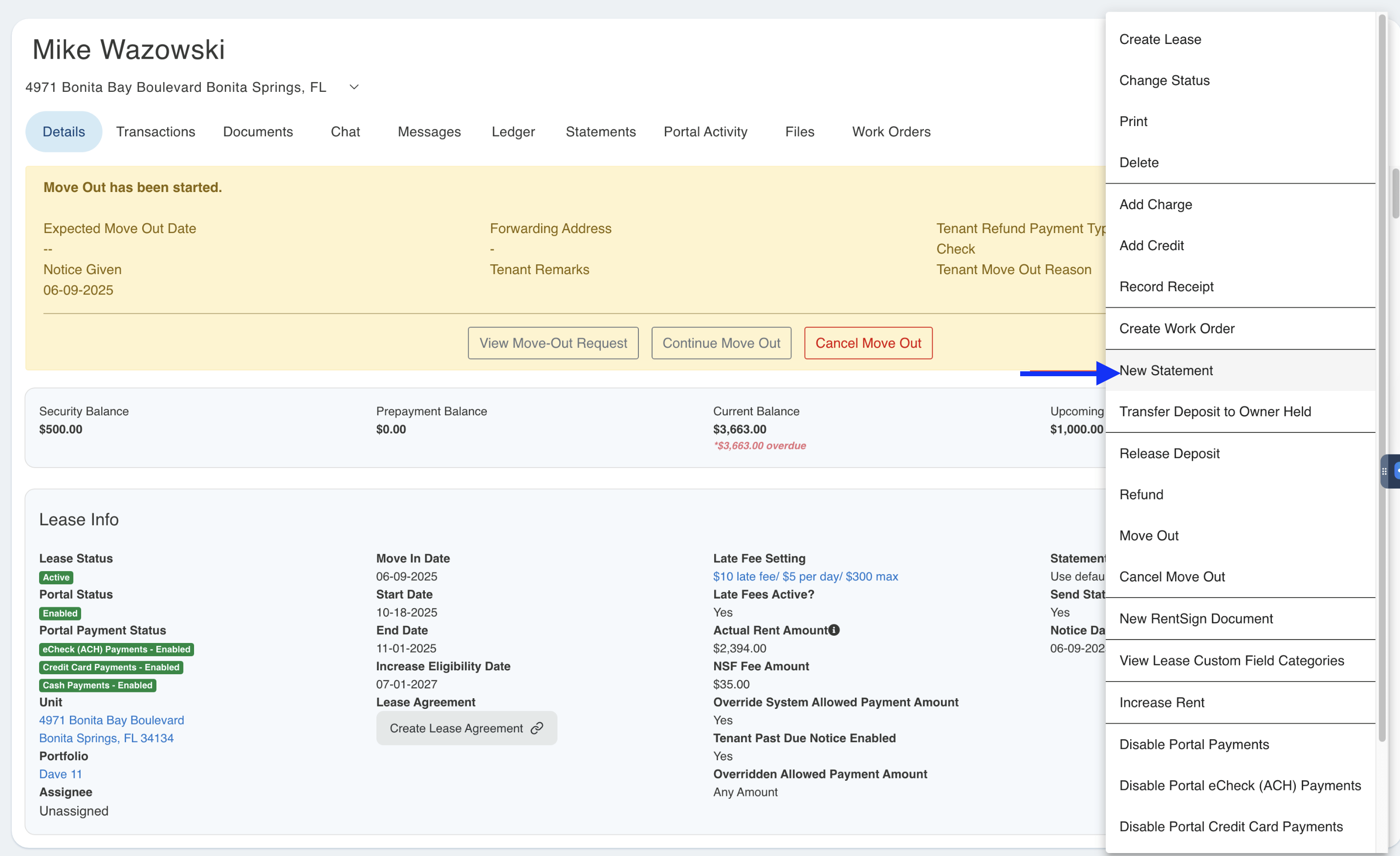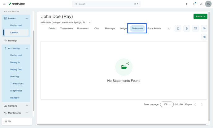 - When in the lease page to generate a tenant statement, you will want to go to the Green Actions>New Statement