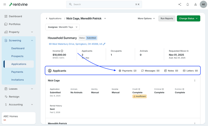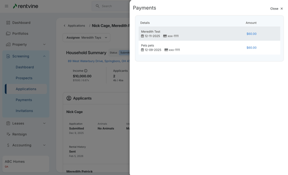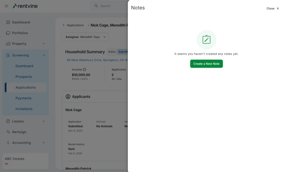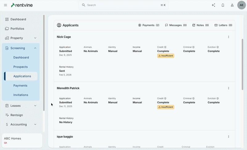 - Attached to each application, you'll also find the payments associated to the application, messages exchanged between the applicants and property managers, notes, and letters made.