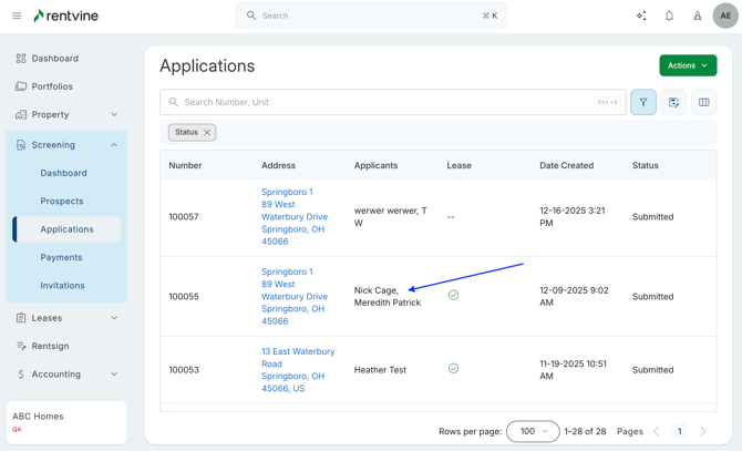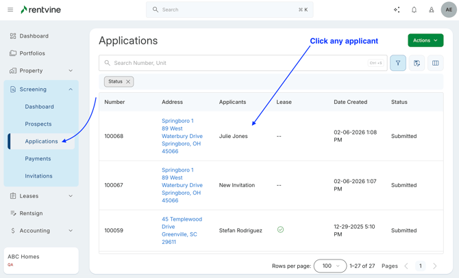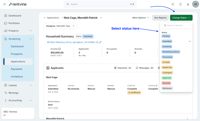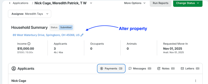 You can also click the blue pencil icon directly to adjust the property the applicant applied to. This can be very convenient in cases where the applicant selected the wrong property or wants to transfer their application to a different property.