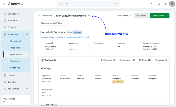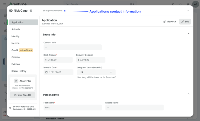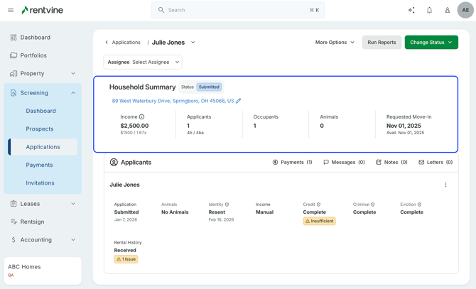 Here you will see a summarized view for applicants at a glance! This includes the unit address, the household income*, the number of applicants, occupants (residents under 18 years old), the animals, and the requested move-in date/availability date for the property.