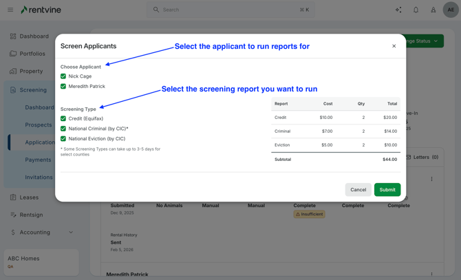 Select the Run reports button to select which reports to run. You can select the applicants and report types you want to run. You can only run reports for applicants with a submitted application status.