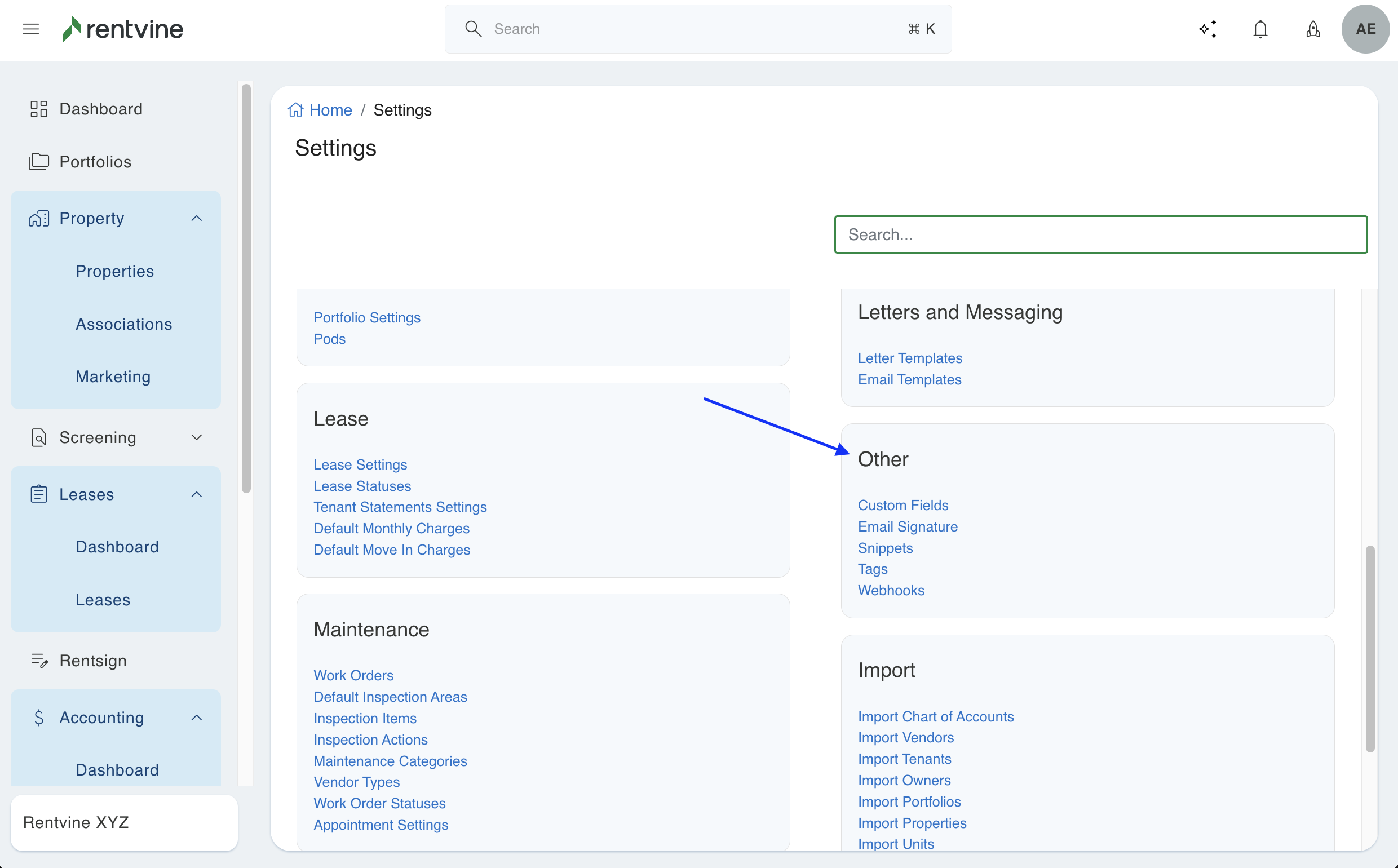 This article will review all of the other settings. The other global settings include custom fields, email signatures, tags, and webhooks in Rentvine.