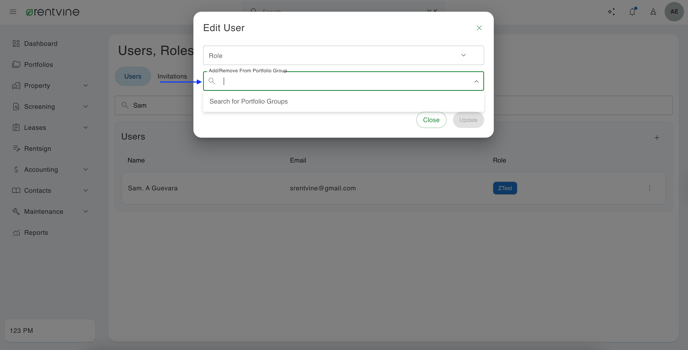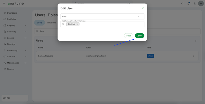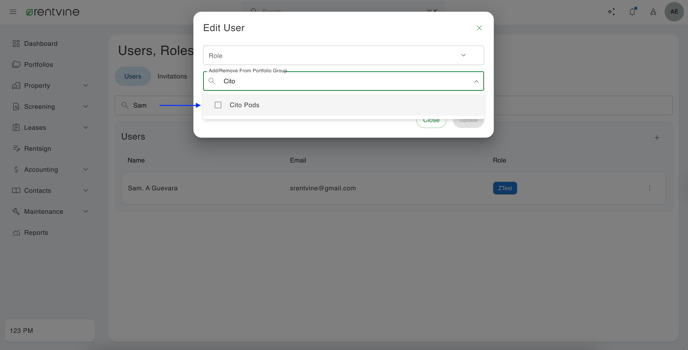 - Click the ellipses next to the Users name > click Edit User > in the Add/Remove From Portfolio Group, type the Pod Name > and click Update