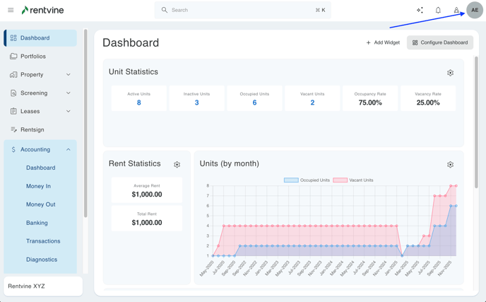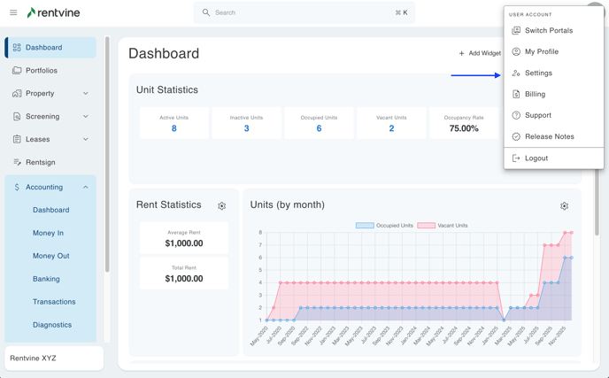 - To get started, click your initials at the top right and click 'Settings' > and here you can see the Portals Settings