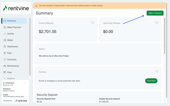 If the tenant does attempt to make a payment using the Pay Deposit button, it will give the resident an error.