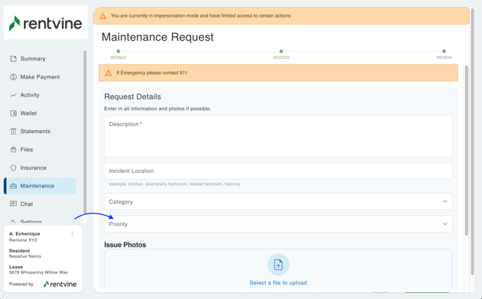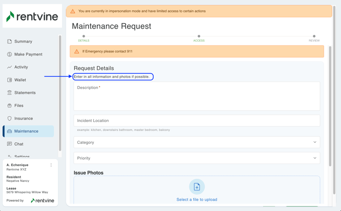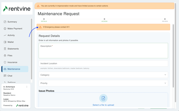- Service Request Alert - This will be a yellow banner at the top of the Maintenance Request Form for the resident to view