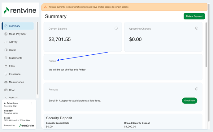 - Resident Notice - This will populate in the Notice section of the Resident Portal